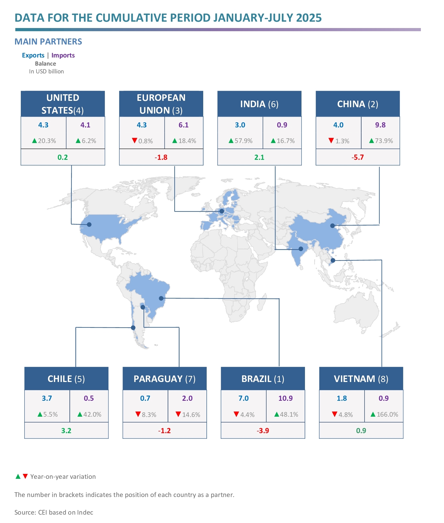 - The main export destinations were Brazil, with a 14.8% share; the EU, with 9.2%, the United States, with 9.1%, and Chile, with 7.8%. In turn, the most outstanding origin of imports were Brazil, 25.0% of the total, China, 22.3%, the EU, 14.0%, and the United States, 9.4%.