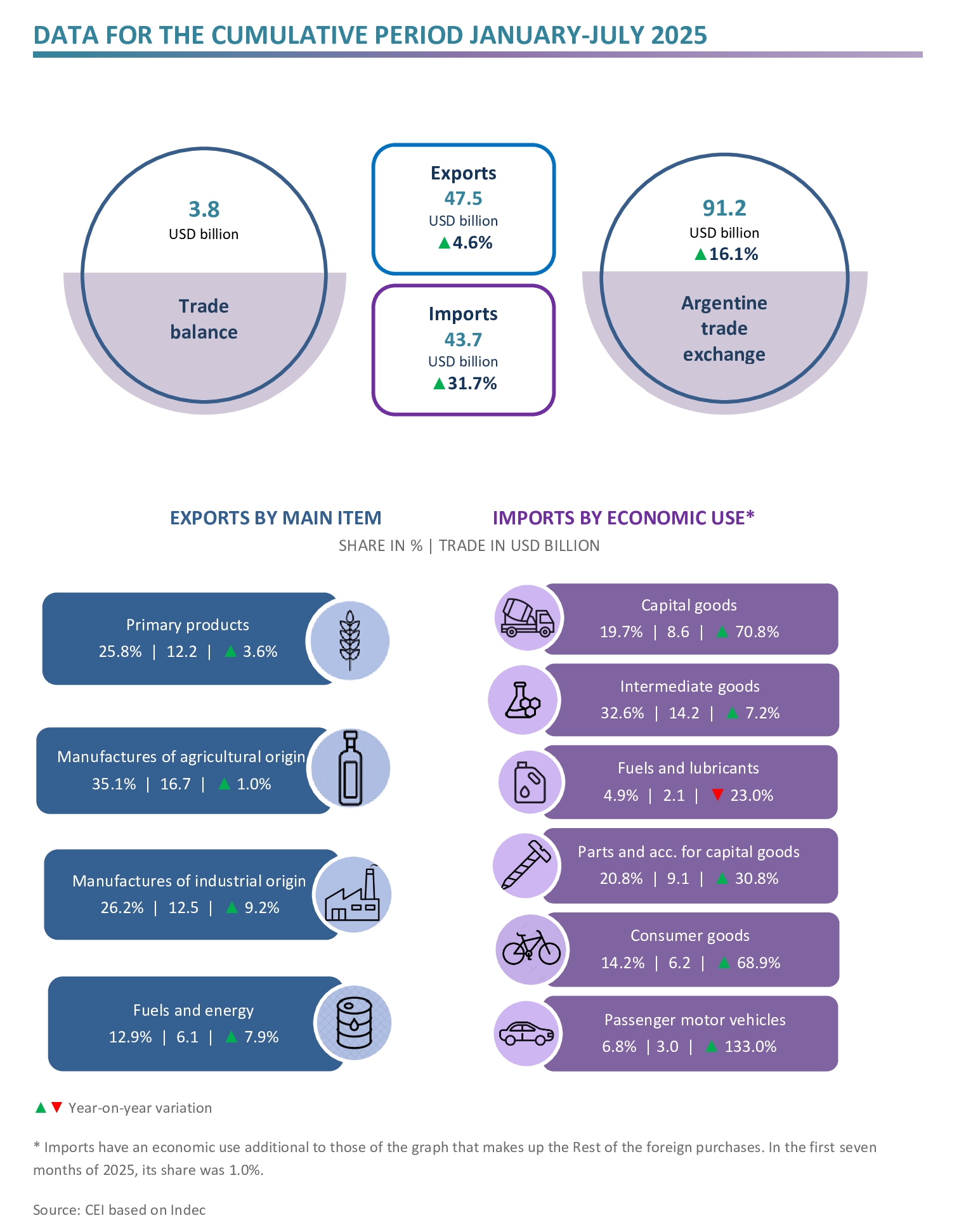 - In the first seven months of 2025, exports totalled USD 47.5 billion, which represents a year-on-year increase of 4.6%, as a result of a rise in the quantities exported (5.0%) that more than offset the decrease in prices (‑0.4%).