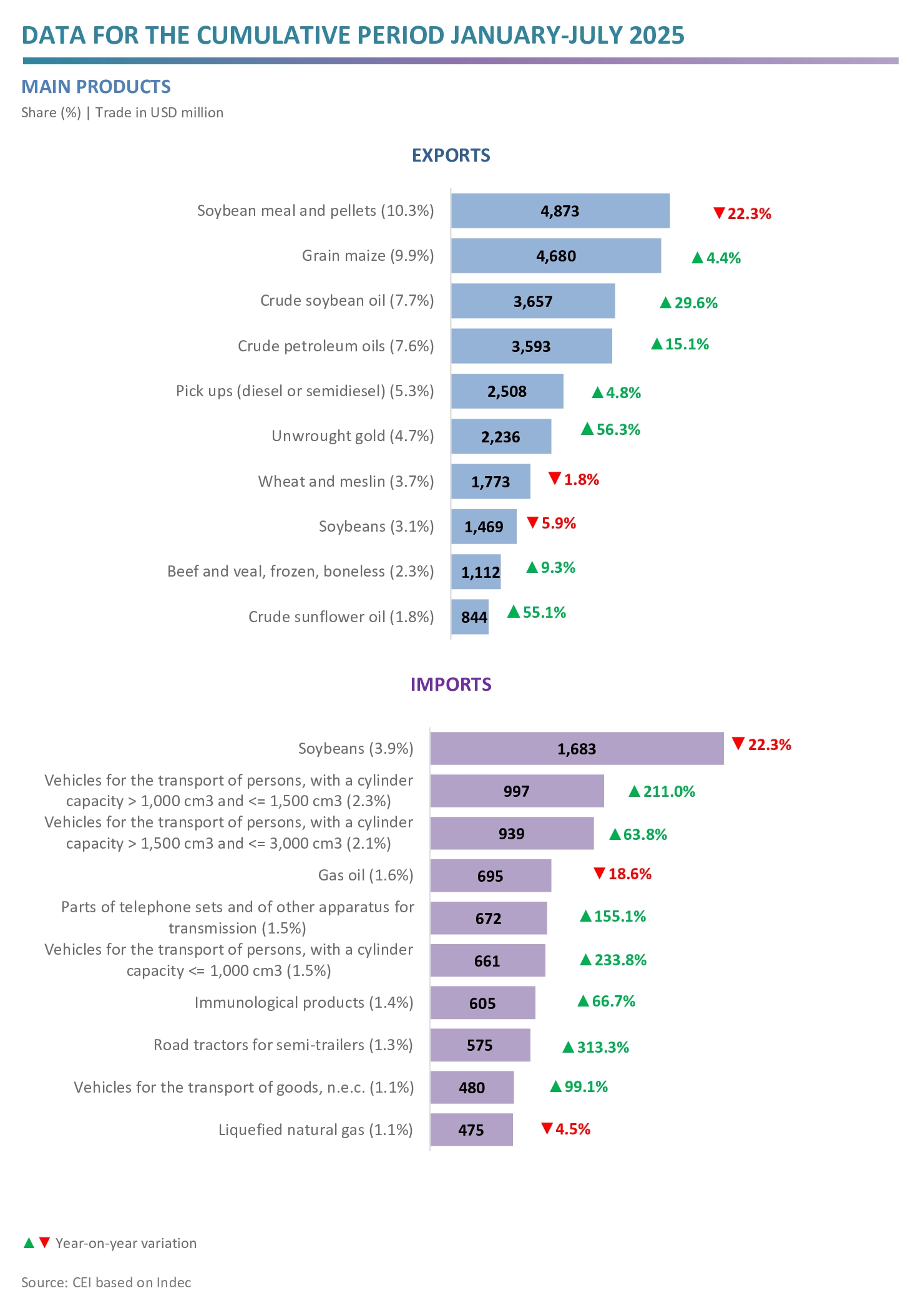 - Regarding imports, the most significant increases occurred in the purchases of vehicles for the transport of persons (USD 1.7 billion), chassis, parts and tyres (USD 1.1 billion), vehicles for the transport of goods (USD 550 million), and telephone parts (USD 408 million); while those of soybeans (‑USD 484 million), natural gas in gaseous state (‑USD 400 million), and gas oil (‑USD 159 million) fell.