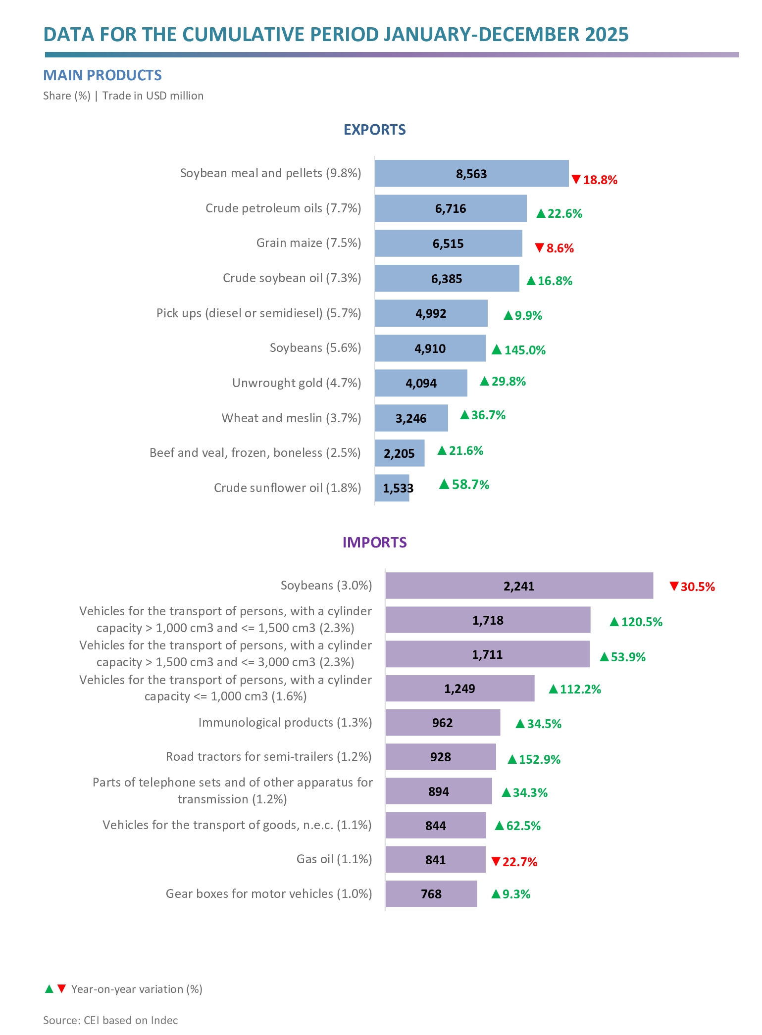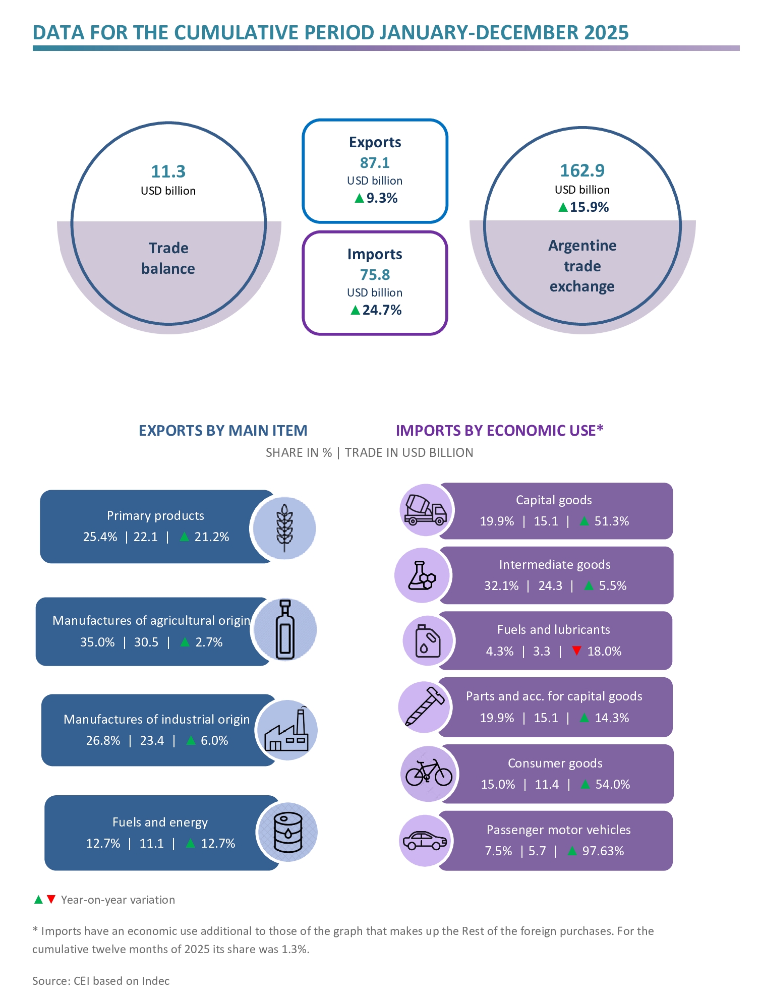 Between January and December 2025, Argentine exports reached USD 87.1 billion (a 9.3% increase compared to 2024), while imports totalled USD 75.8 billion (a 24.7% year-on-year rise). As a result, a trade surplus of USD 11.3 billion was recorded.