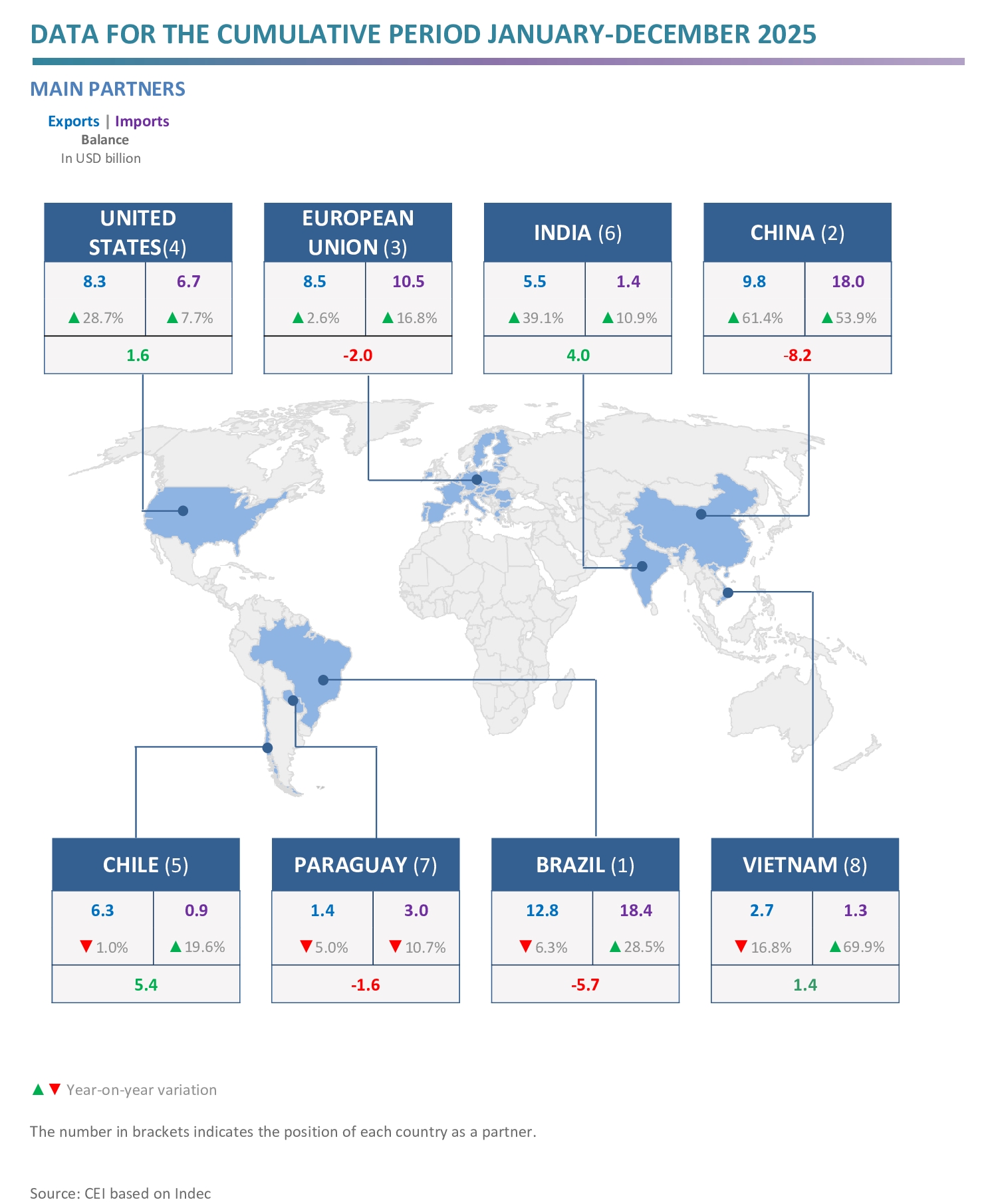 - The main export destinations were Brazil, with a 14.7% share; China, with 11.3%, the EU, with 9.7%, and the United States, with 9.6%. In turn, the most prominent origins of imports were Brazil, 24.3% of the total, China, 23.7%, the EU, 13.8%, and the United States, 8.8%.