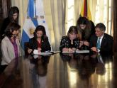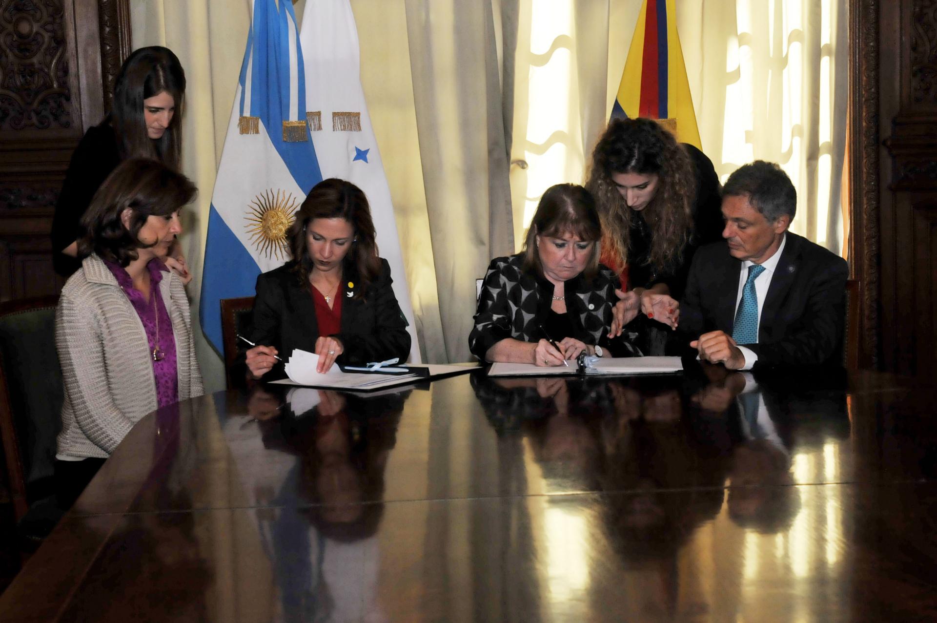 The Foreign Ministers of Argentina and Colombia, Susana Malcorra and Angela Holguín, alongside the Ministers of Production Francisco Cabrera and María Claudia Lacouture, at the signing of a Trade Complementation and Productive Development Agreement at the Palacio San Martín. Photo credit: Roberto Garagiola.