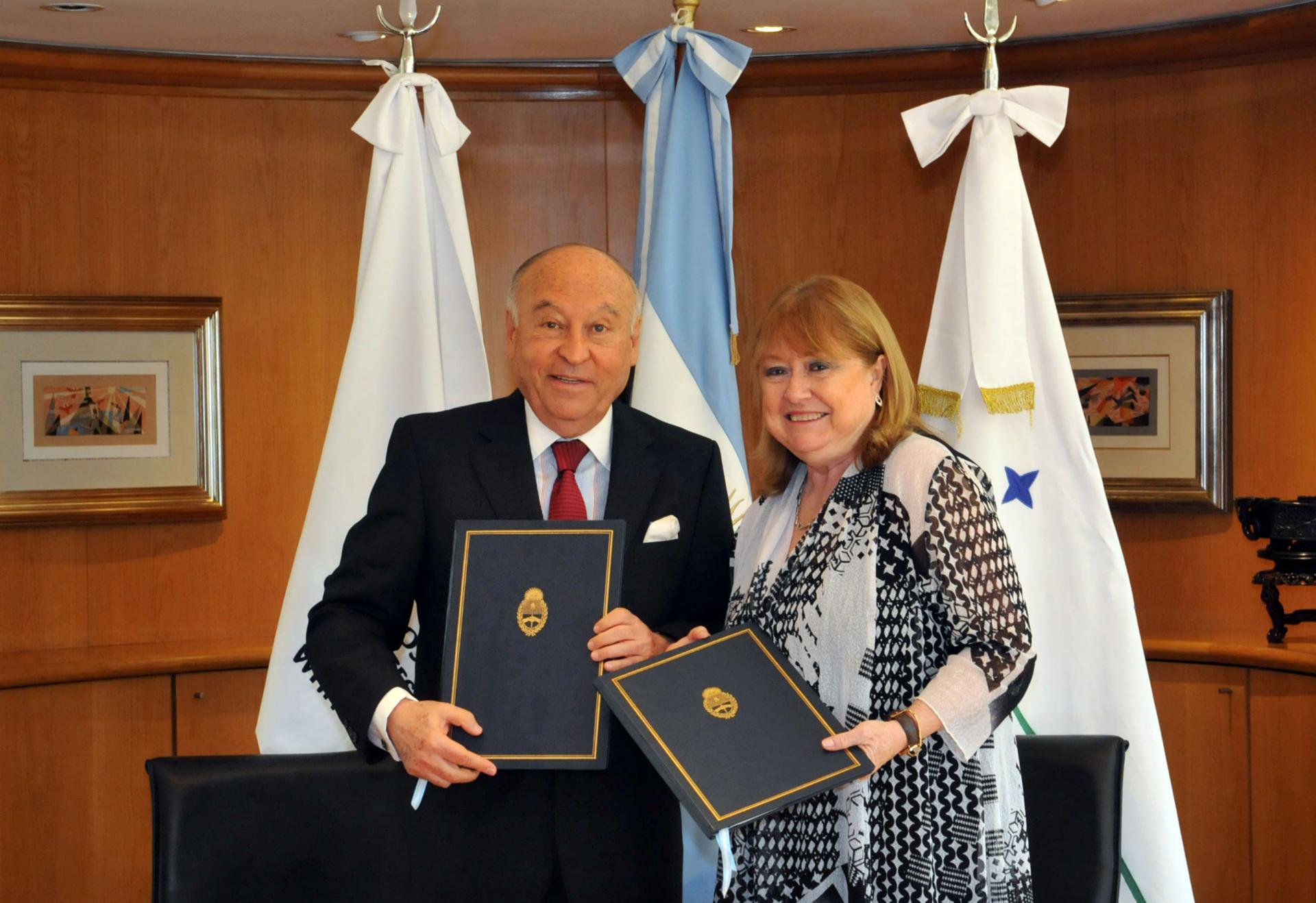La Canciller Argentina, Susana Malcorra, firmó hoy un convenio con el presidente de la Corporación Andina de Fomento (CAF) Banco de Desarrollo de América Latina, Enrique García Rodríguez, para que la Comisión Cascos Blancos de la Cancillería pueda desarrollar proyectos específicos en la región sobre Reducción del Riesgo de Desastres y Asistencia Humanitaria.