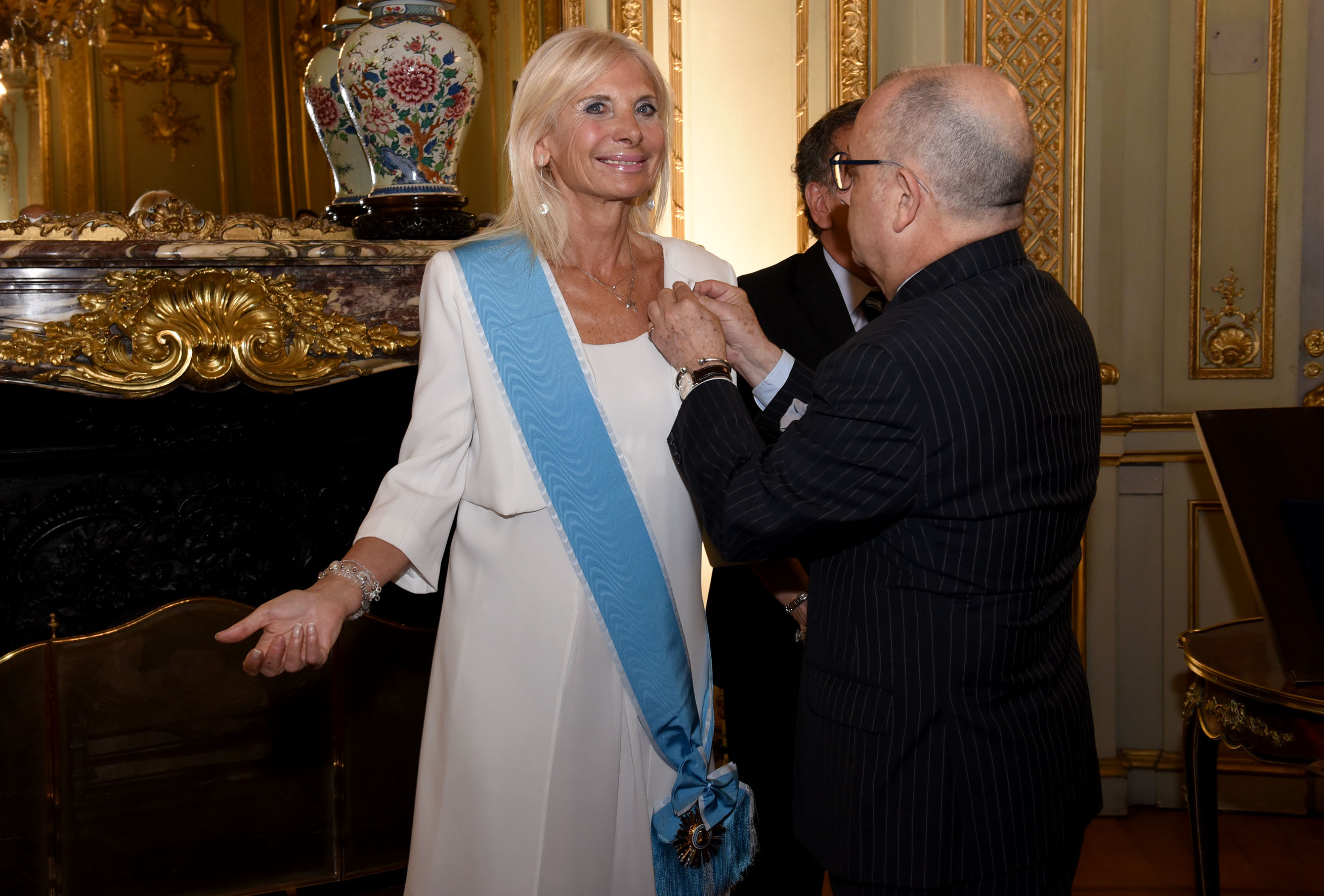 En el Salón Dorado del Palacio San Martín, el canciller Jorge Faurie despidió a la Embajadora de la República Italiana, Teresa Castaldo, y la condecoró con la Orden del Libertador San Martín en el grado de Gran Cruz, la mas alta distinción que entrega el país a ciudadanos extranjeros por su destacada labor como diplomática acreditada en la Argentina. Participaron del evento además Ministros del Gobierno y diplomáticos acreditados. Foto Roberto Daniel Garagiola