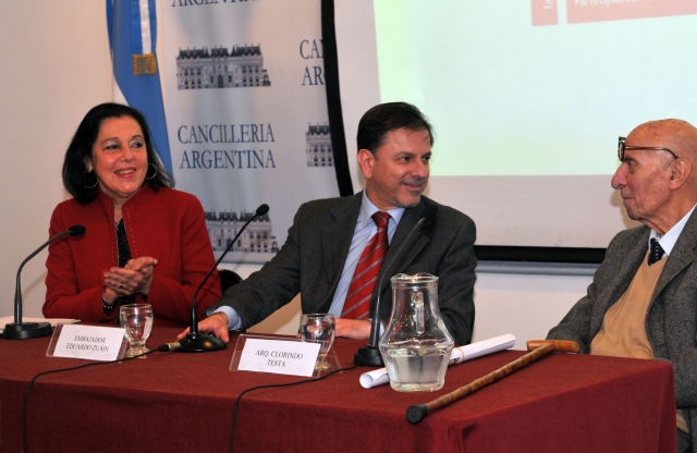 El Vicecanciller argentino, Eduardo Zuaín junto al arquitecto, artista plástico y curador de la presentación argentina, Clorindo Testa, y la Embajadora Magdalena Faillace, Directora de Asuntos Culturales de la Cancillería.