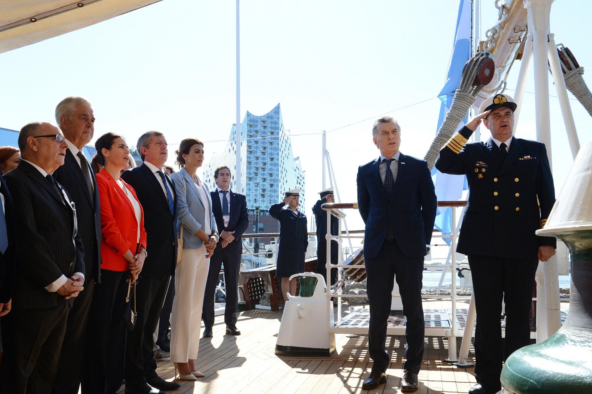Hamburgo, Alemania, 9 de julio de 2017 - El presidente Mauricio Macri, acompañado por el canciller Jorge Faurie, encabezó hoy la celebración del Día de la Independencia a bordo de la Fragata Libertad en el puerto de esta ciudad.