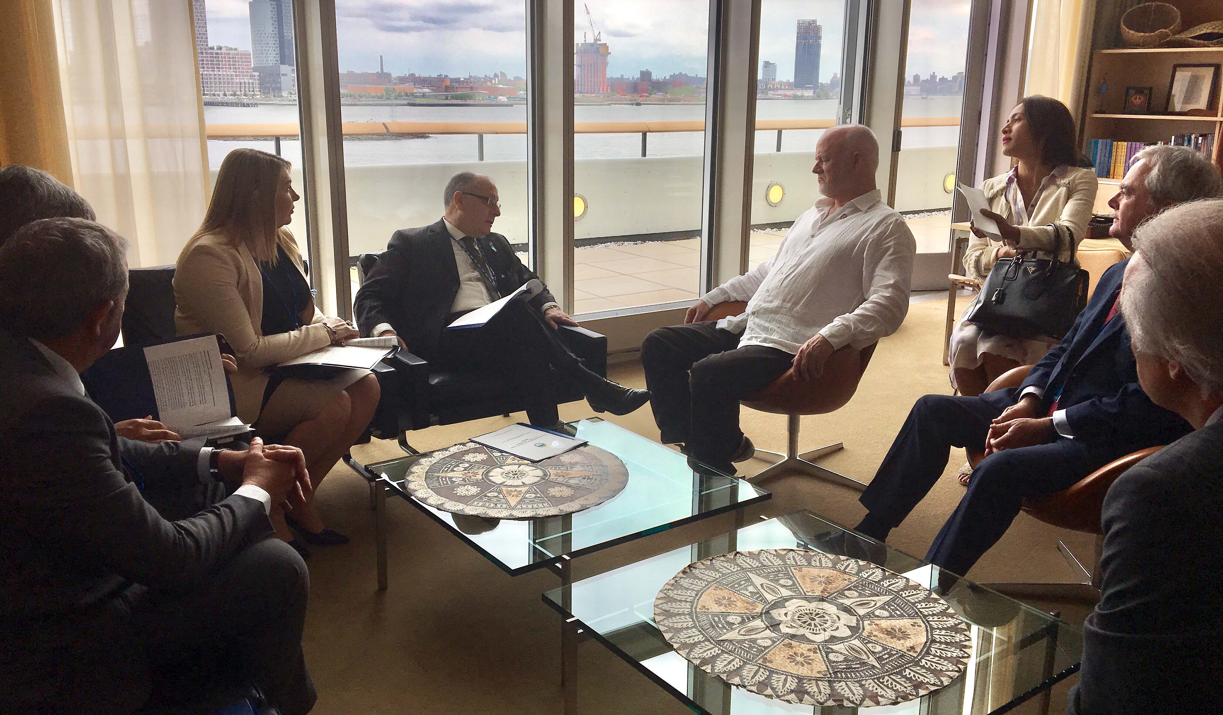 El Canciller Jorge Faurie; los senadores los senadores nacionales Federico Pinedo, Julio Cobos y Rodolfo Urtubey; la Gobernadora de Tierra del Fuego, Antártida e Islas del Atlántico Sur, Roxana Bertone, y el representante argentino ante la ONU, Martín García Moritán mantuvieron hoy por la tarde en la sede del organismo una reunión con el Presidente de la Asamblea General de las Naciones Unidas, Peter Thomson.