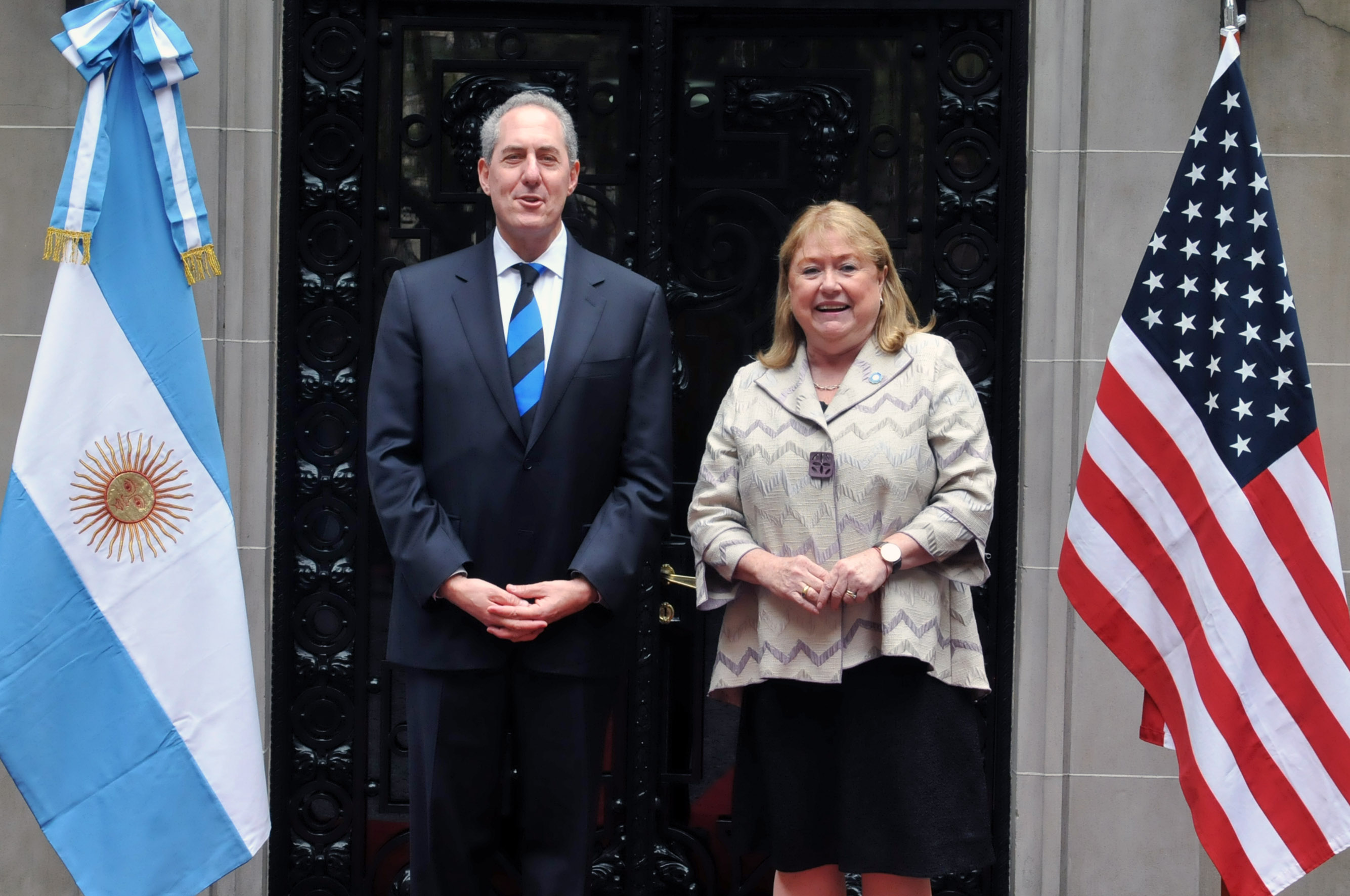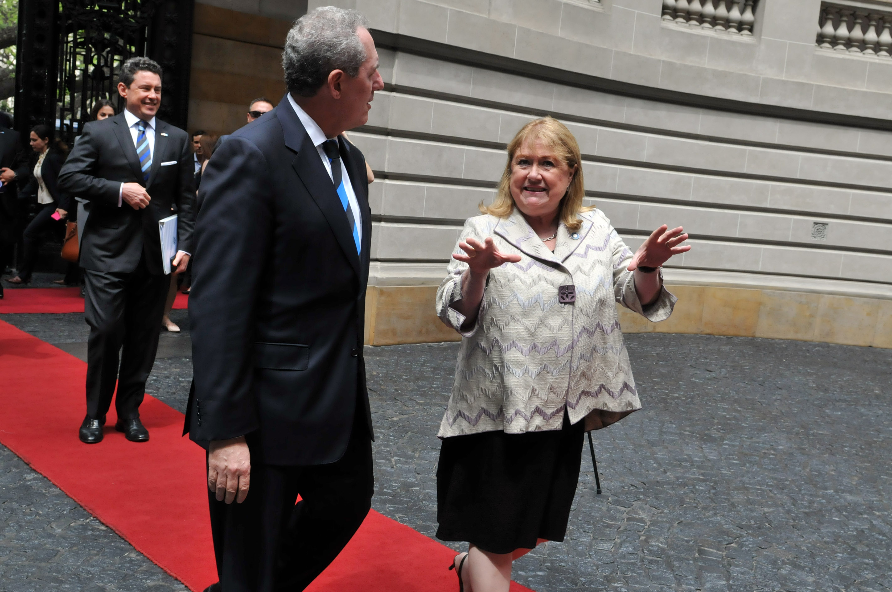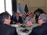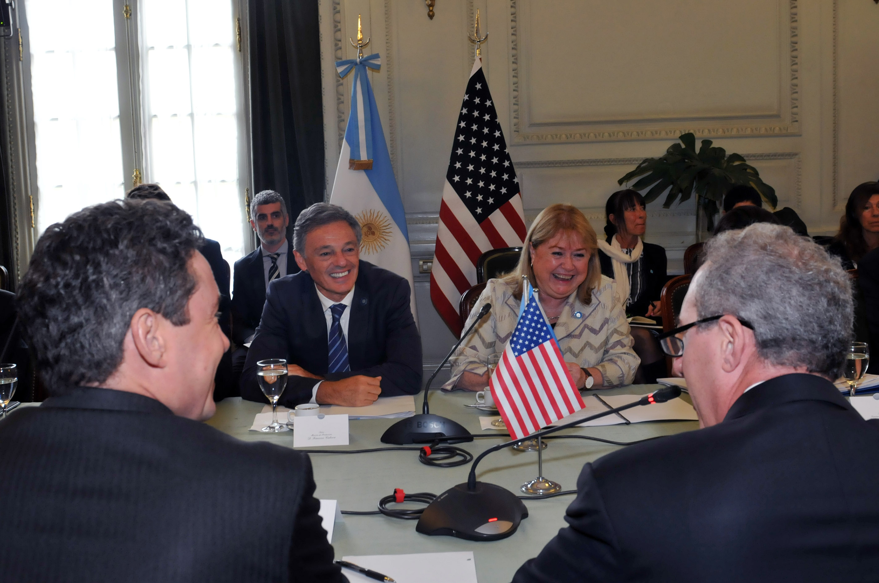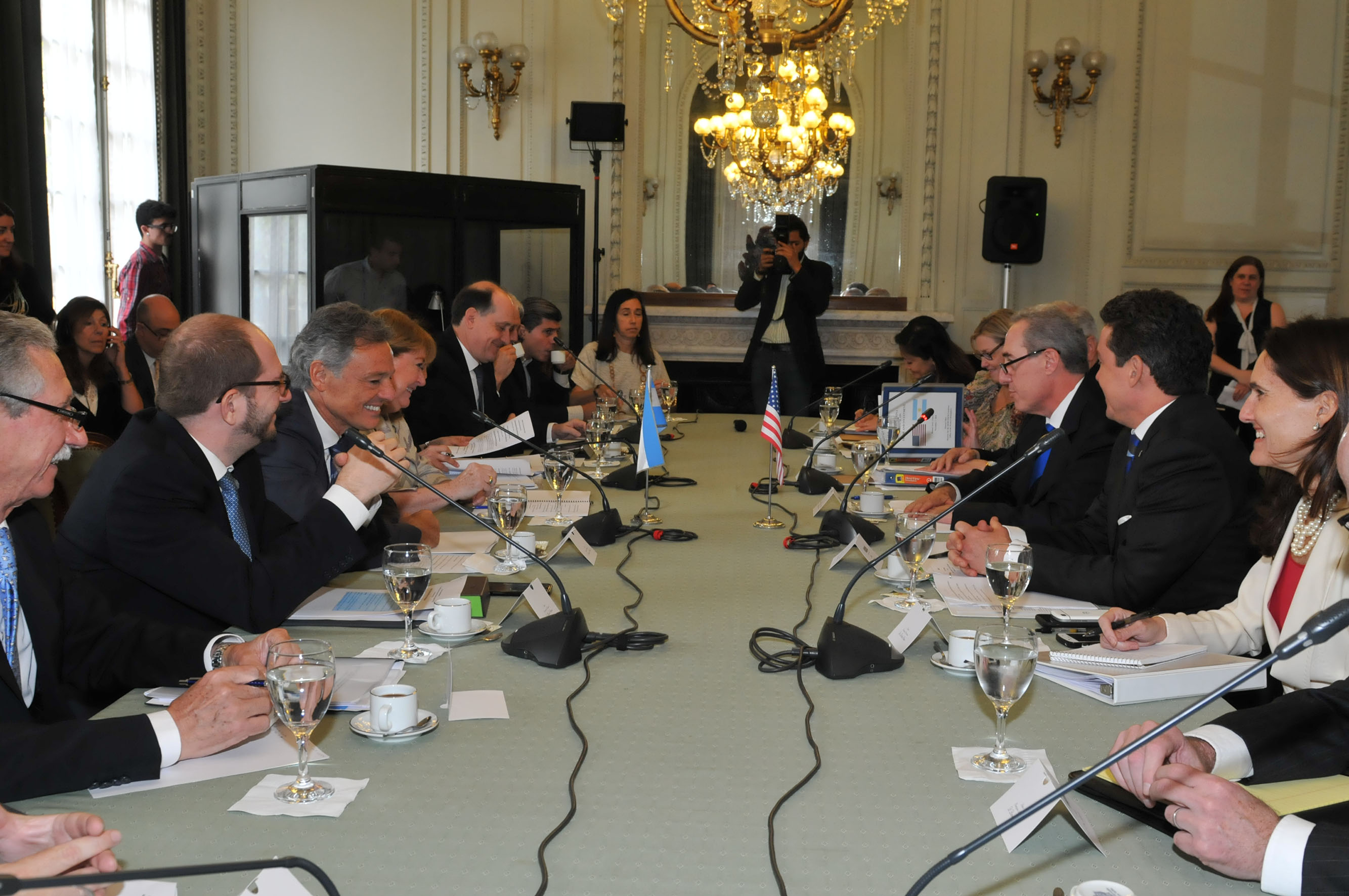 La canciller Susana Malcorra, junto al Ministro de Producción, Francisco Cabrera, recibieron esta mañana en el Palacio San Martín al Representante de Comercio de los Estados Unidos, embajador Michael Froman, en el marco de la primera reunión del Consejo del Acuerdo Marco de Comercio e Inversiones con los EEUU. foto Roberto Daniel Garagiola