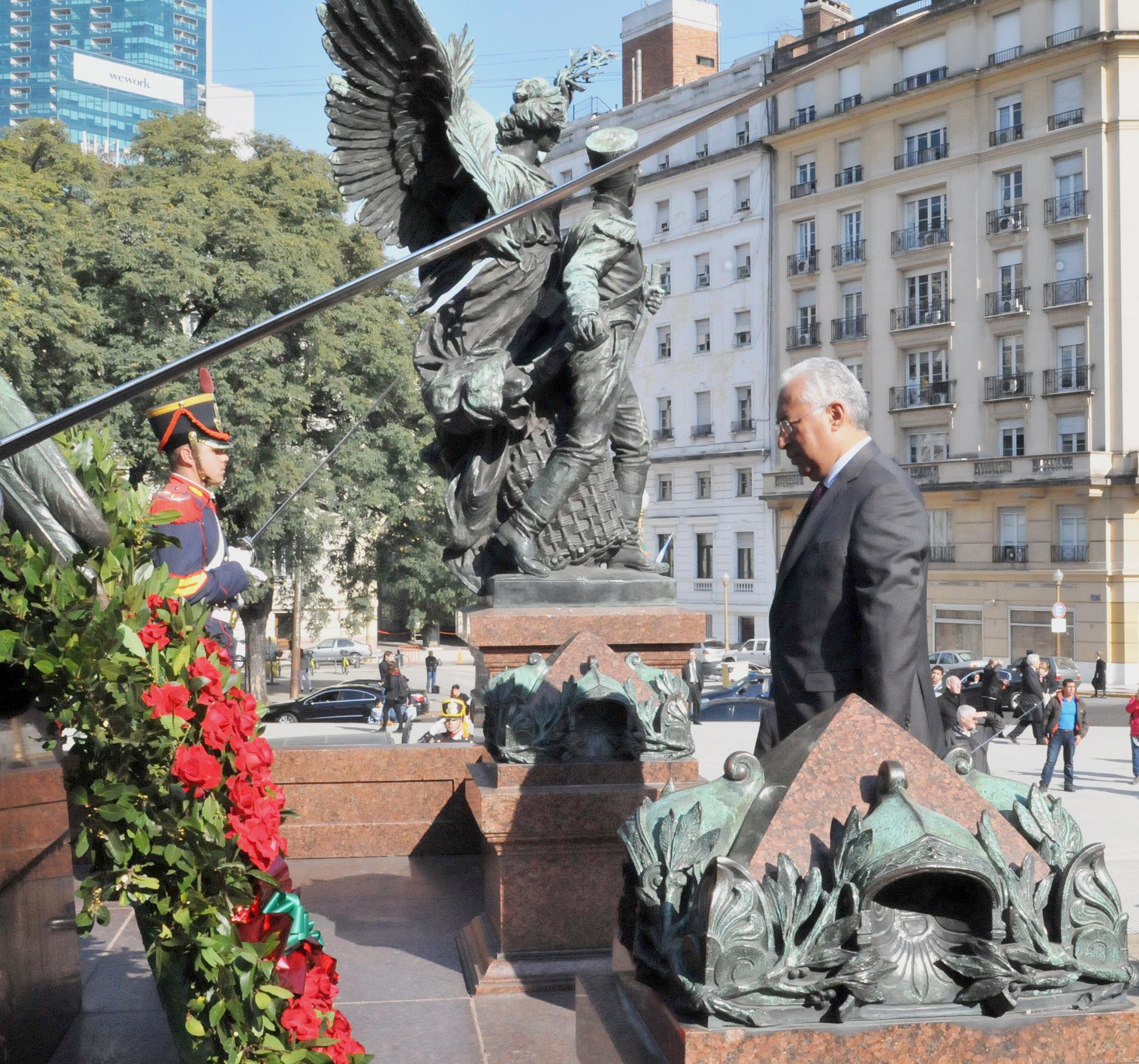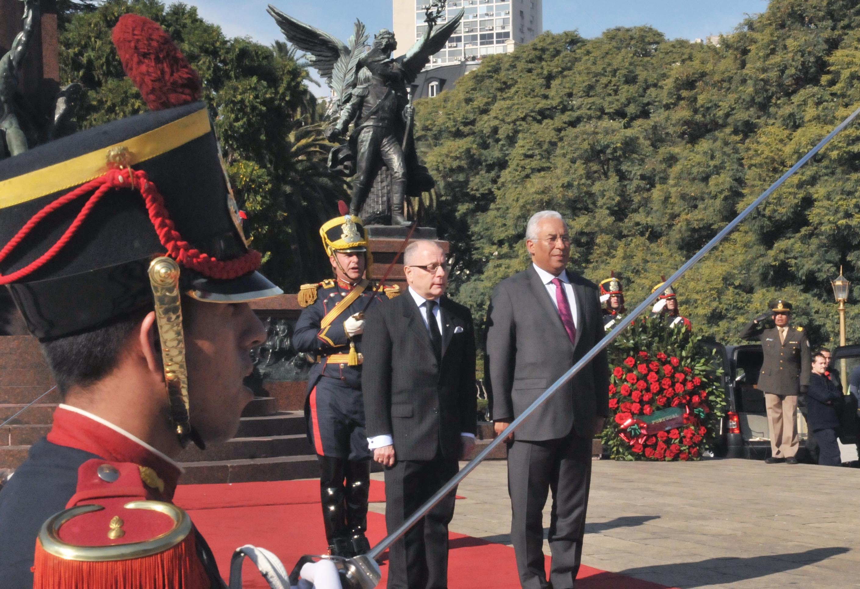 En su primer acto público, el canciller Jorge Faurie recibió este mediodía al Primer Ministro de Portugal, António Costa, a quien acompañó en la tradicional ofrenda floral en la Plaza San Martín en honor del gran Libertador argentino.