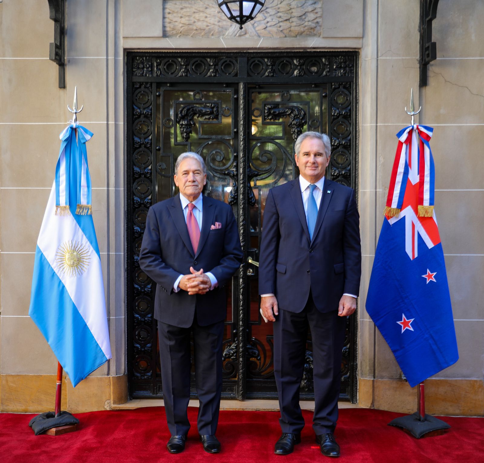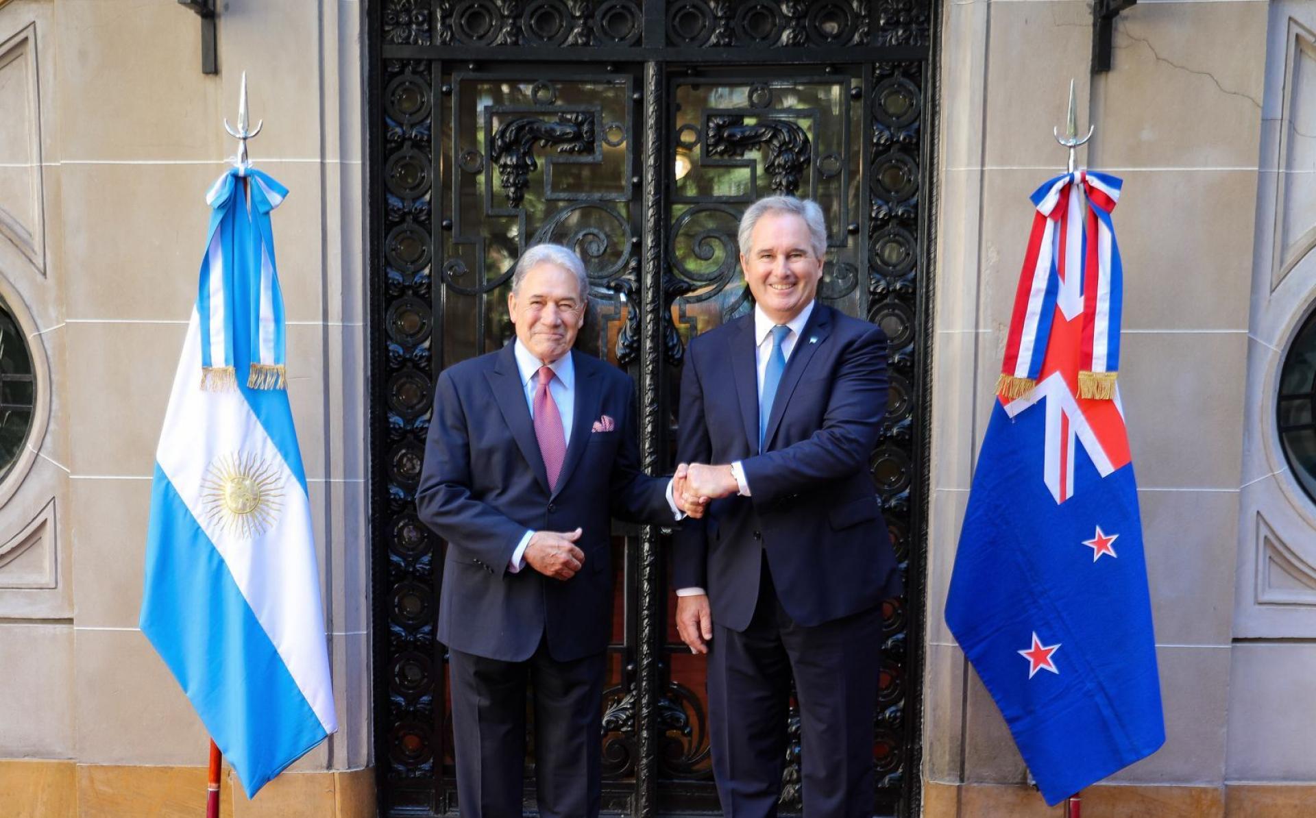 El Canciller Pablo Quirno recibió hoy en el Palacio San Martín al Ministro de Relaciones Exteriores de Nueva Zelanda, Rt. Hon Winston Peters, en el marco de la primera visita a la Argentina de un funcionario neozelandés de ese nivel en 19 años, lo que refleja el renovado interés de ambas partes en profundizar el vínculo bilateral.