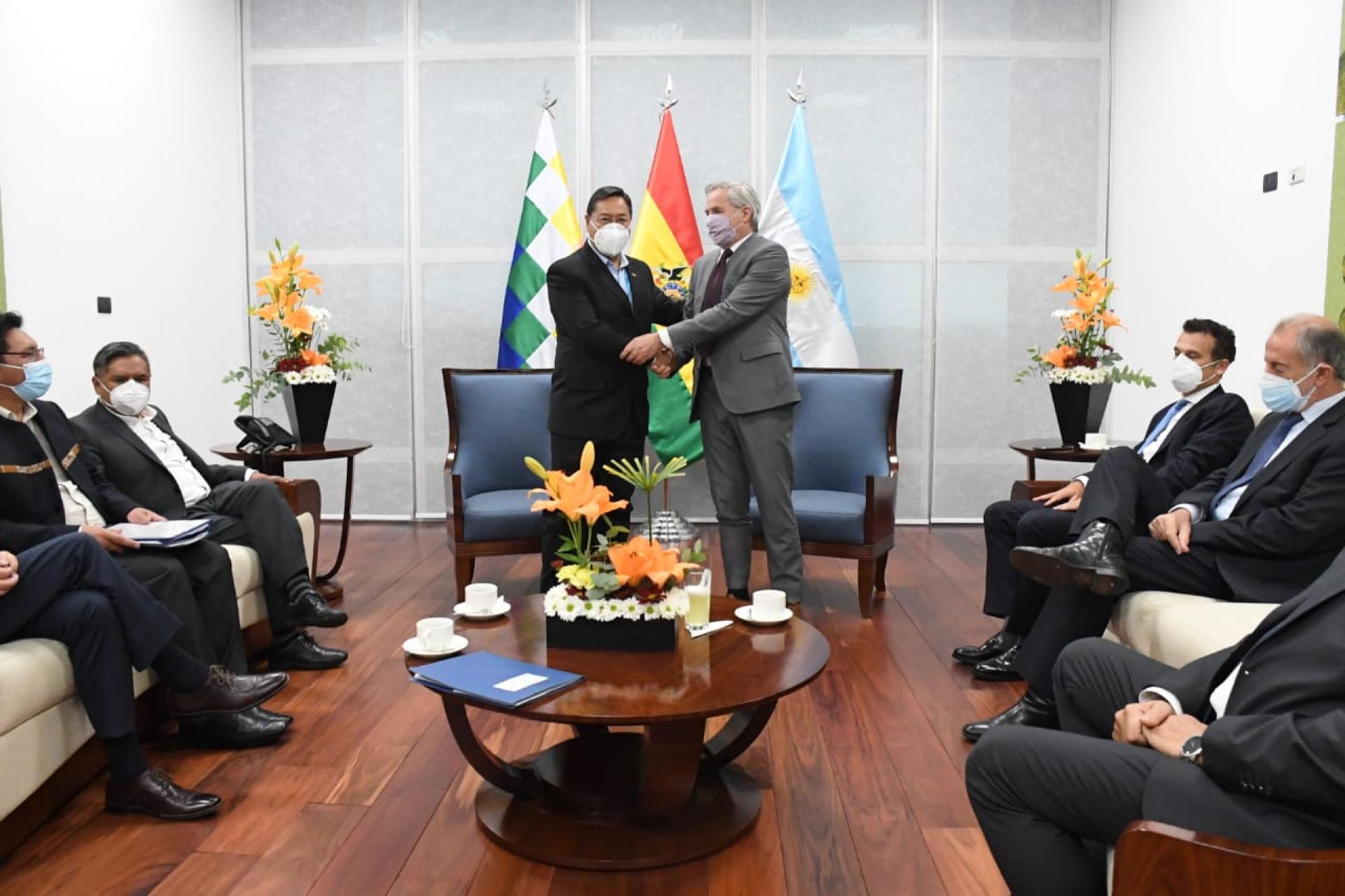 El canciller estuvo acompañado en ambas reuniones por el jefe de Gabinete, Guillermo Justo Chaves; el secretario de Relaciones Económicas Internacionales, Jorge Neme; el subsecretario para América Latina, Juan Valle; y el embajador designado en La Paz, Ariel Basteiro.