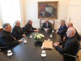 El presidente Alberto Fernández, acompañado por el ministro de Relaciones Exteriores, Comercio Internacional y Culto, Felipe Solá, y el secretario de Culto, Guillermo Oliveri, recibió esta mañana en la Casa Rosada a la cúpula de la Conferencia Episcopal Argentina, que asistió al encuentro encabezada por su presidente y obispo de San Isidro, Oscar Vicente Ojea.