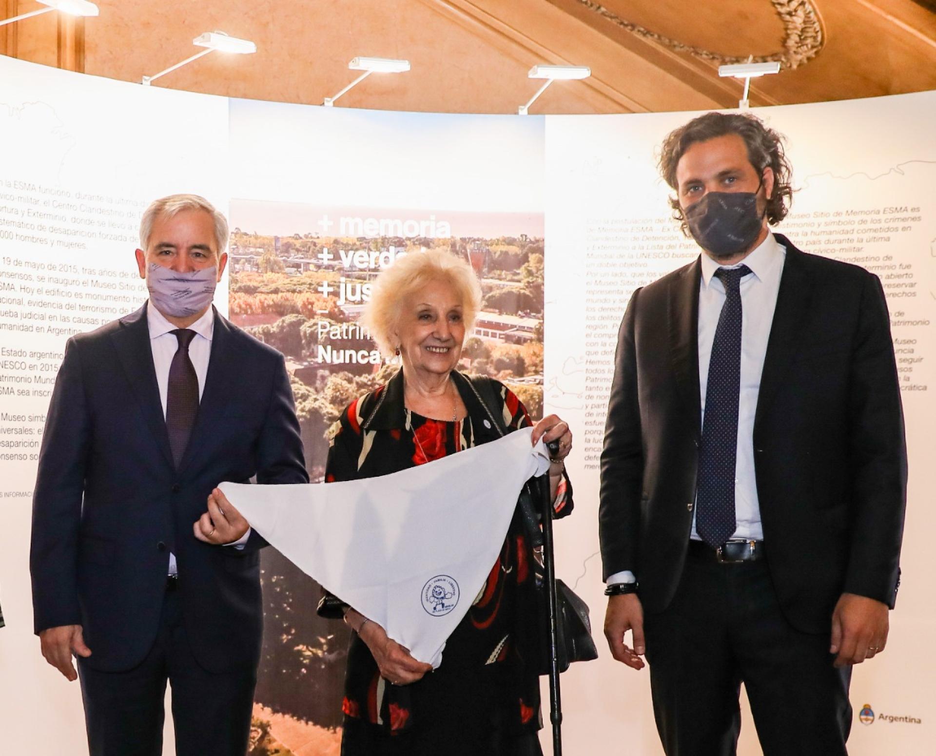 Posteriormente comenzó en el Palacio San Martín, la muestra del Museo Sitio Esma “Memoria Argentina para el Mundo Patrimonio del Nunca Más”, que contó también con la presencia del secretario de Derechos Humanos, Horacio Pietragalla Corti.