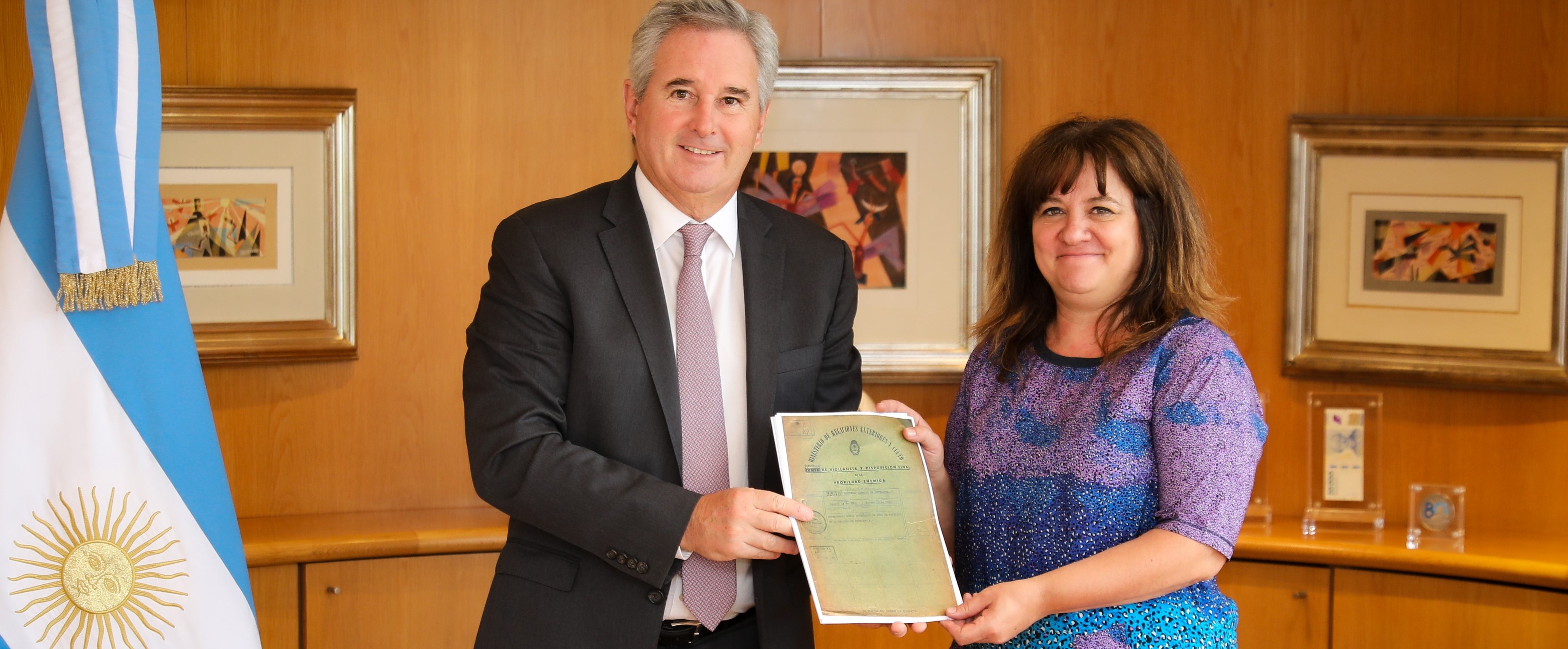El Canciller Pablo Quirno entregó hoy 6508 copias de documentos históricos sobre la Segunda Guerra Mundial y el Holocausto a la Representante para América Latina del Programa Internacional de Archivos del Museo Conmemorativo del Holocausto de Estados Unidos, Samanta Casareto.