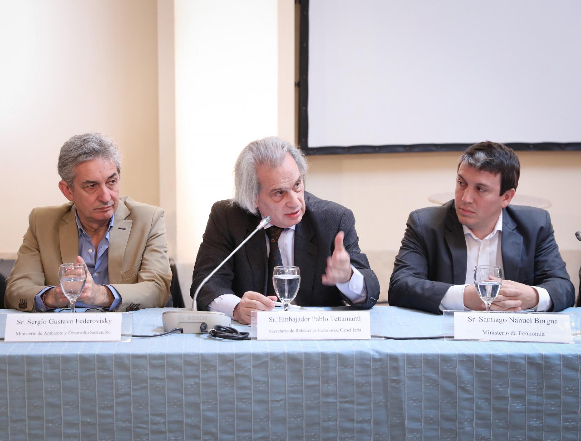 El evento fue inaugurado por el Vicecanciller Pablo Tettamanti, quien estuvo acompañado por el Secretario de Control y Monitoreo Ambiental del Ministerio de Ambiente y Desarrollo Sostenible, Sergio Gustavo Federovisky, y el Director de Industria Sostenible del Ministerio de Economía, Santiago Nahuel Borgna.