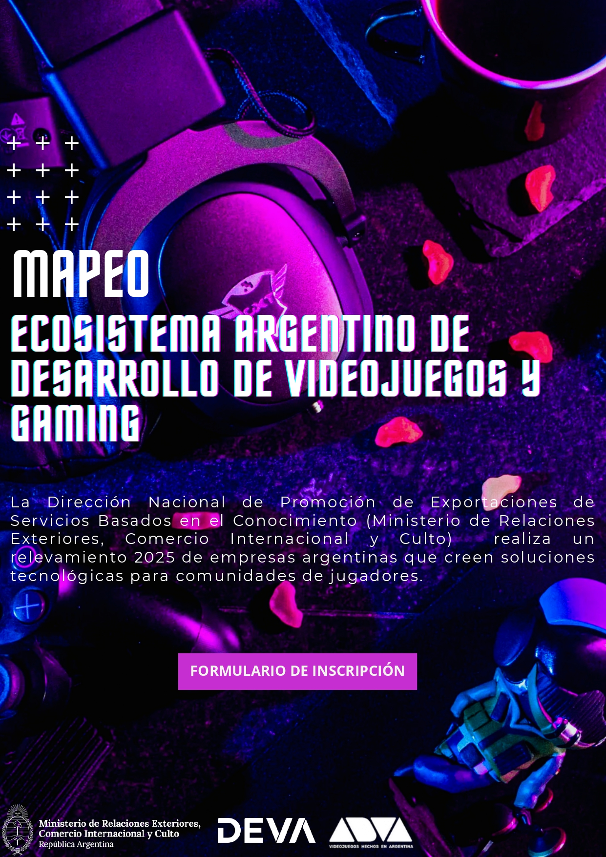 El Ministerio de Relaciones Exteriores, Comercio Internacional y Culto, con el apoyo de la Asociación de Deportes Electrónicos y Videojuegos de Argentina (DEVA) y de la Asociación de Desarrolladores de Videojuegos Argentinos (ADVA), está llevando adelante un relevamiento nacional del ecosistema argentino de Desarrollo de Videojuegos y Gaming. El objetivo principal es contar con información precisa y actualizada que permita crear un catálogo de la oferta exportable del sector y promover la visibilidad internacional de los actores del ecosistema argentino para potenciar oportunidades de negocios, alianzas y financiación.