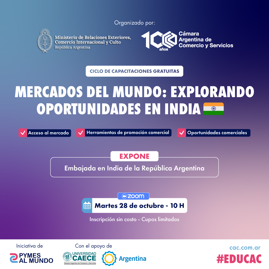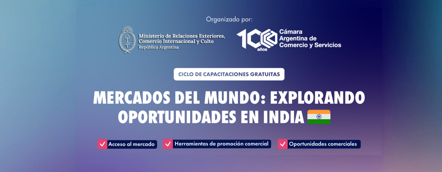 La Cancillería argentina, junto a la Cámara Argentina de Comercio y Servicios, invitan a usted a participar de este encuentro en el que podrá conocer de primera mano las oportunidades comerciales que presenta el mercado indio.