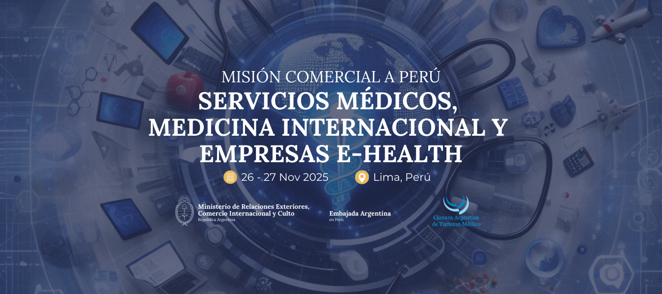El Ministerio de Relaciones Exteriores, Comercio Internacional y Culto, a través de la Dirección de Promoción de Exportaciones de Servicios Basados en el Conocimiento, Industrias Creativas, Turismo y Deportes (DNTEC), junto a la Cámara Argentina de Turismo Médico, convocan a la Misión comercial del sector de servicios médicos, medicina internacional y empresas E-health, que se llevará a cabo en Lima, Perú, los días 26 y 27 de noviembre de 2025 dirigida a: