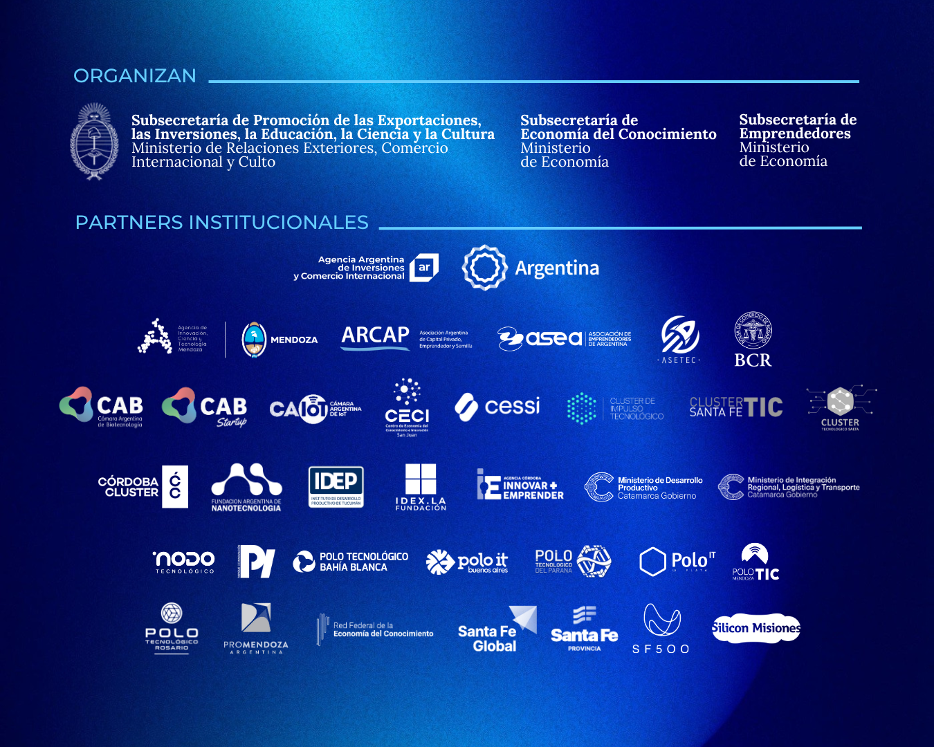 A la fecha, la iniciativa cuenta con el apoyo de las siguientes instituciones: Agencia Argentina de Inversiones y Comercio Internacional (AAICI); Agencia Córdoba Innovar y Emprender; Agencia de Innovación, Ciencia y Tecnología de Mendoza; Agencia Santa Fe Global; Asociación de Emprendedores de Argentina (ASEA); Asociación de Emprendedores Tecnológicos (ASETEC); Bolsa de Comercio de Rosario; Cámara Argentina de Internet de las Cosas (CAIoT); Cámara Argentina de la Industria del Software (CESSI); Centro de Economía del Conocimiento e Innovación de San Juan; Clúster de Impulso Tecnológico; Cluster TIC Santa Fe; Córdoba Cluster; Fundación Argentina de Nanotecnología (FAN); Instituto de Desarrollo Productivo de Tucumán (IDEP); Instituto para el Desarrollo Exponencial de Latinoamérica (IDEX.LA); Nodo Tecnológico de la Ciudad de Catamarca; Parque de la Innovación BA; Polo IT Buenos Aires; Polo Tecnológico Bahía Blanca; Polo Tecnológico del Paraná; Polo Tecnológico Rosario; Polo TIC Mendoza; Provincia de Catamarca - Ministerio de Desarrollo Productivo; Provincia de Catamarca - Ministerio de Integración Regional, Logística y Transporte - Secretaría de Relaciones Internacionales.