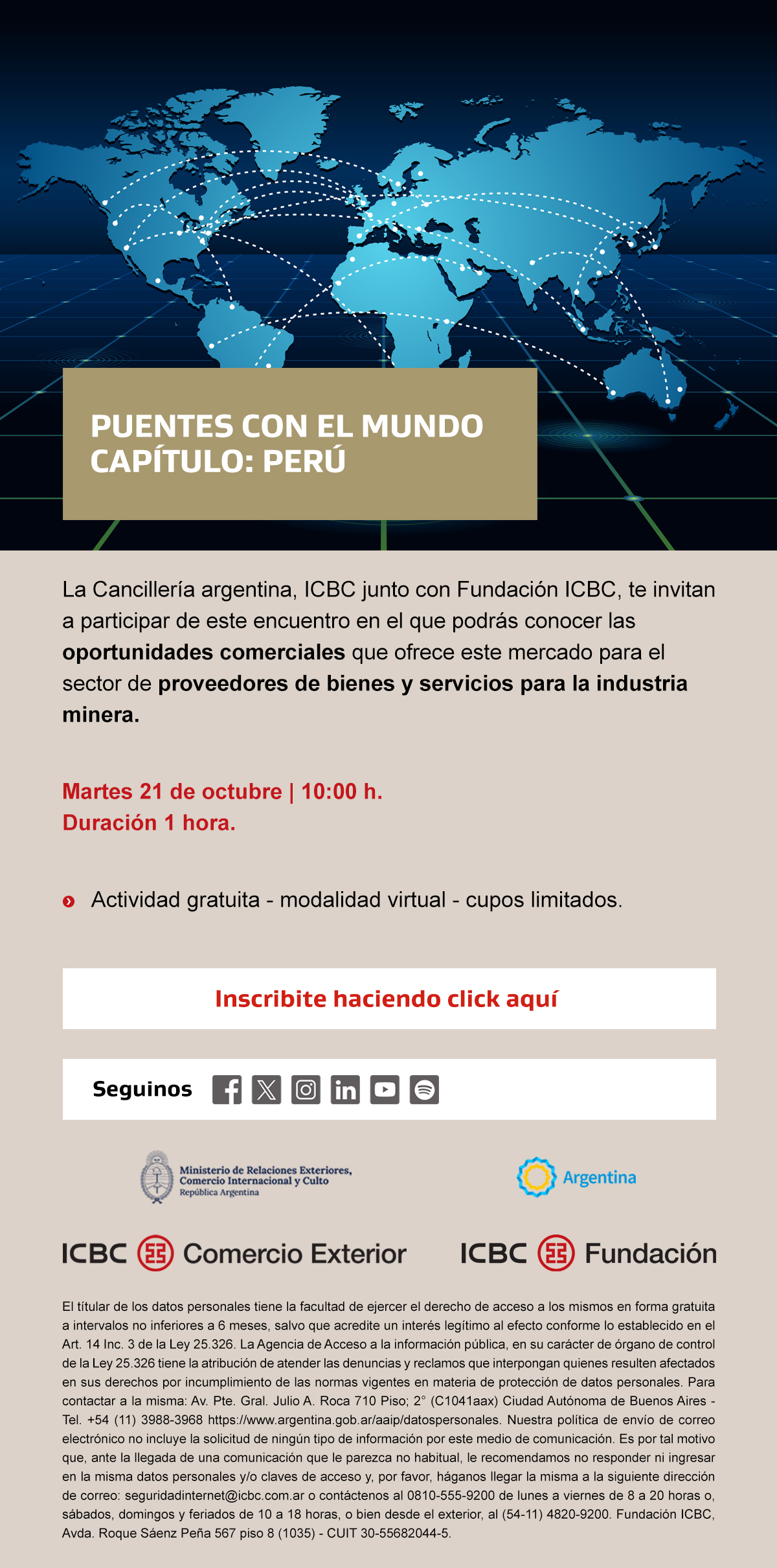 La Cancillería argentina, ICBC junto con Fundación ICBC, te invitan a participar de este encuentro en el que podrás conocer las oportunidades comerciales que ofrece este mercado para el sector de proveedores de bienes y servicios para la industria minera.