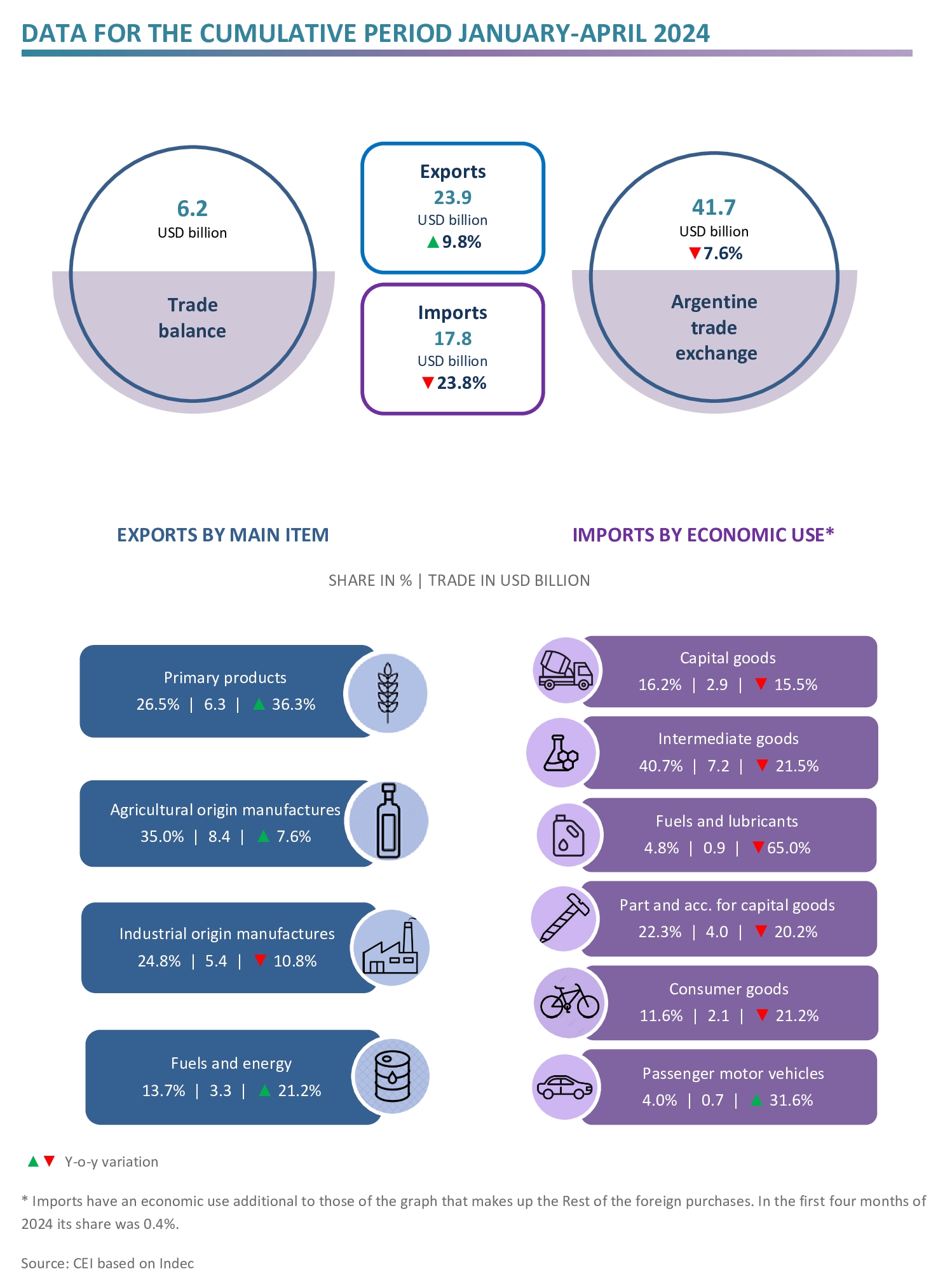 - Consequently, the trade balance reached a surplus of USD 6.2 billion, whereas in the first four months of 2023 a deficit of USD 1.5 billion had been recorded.