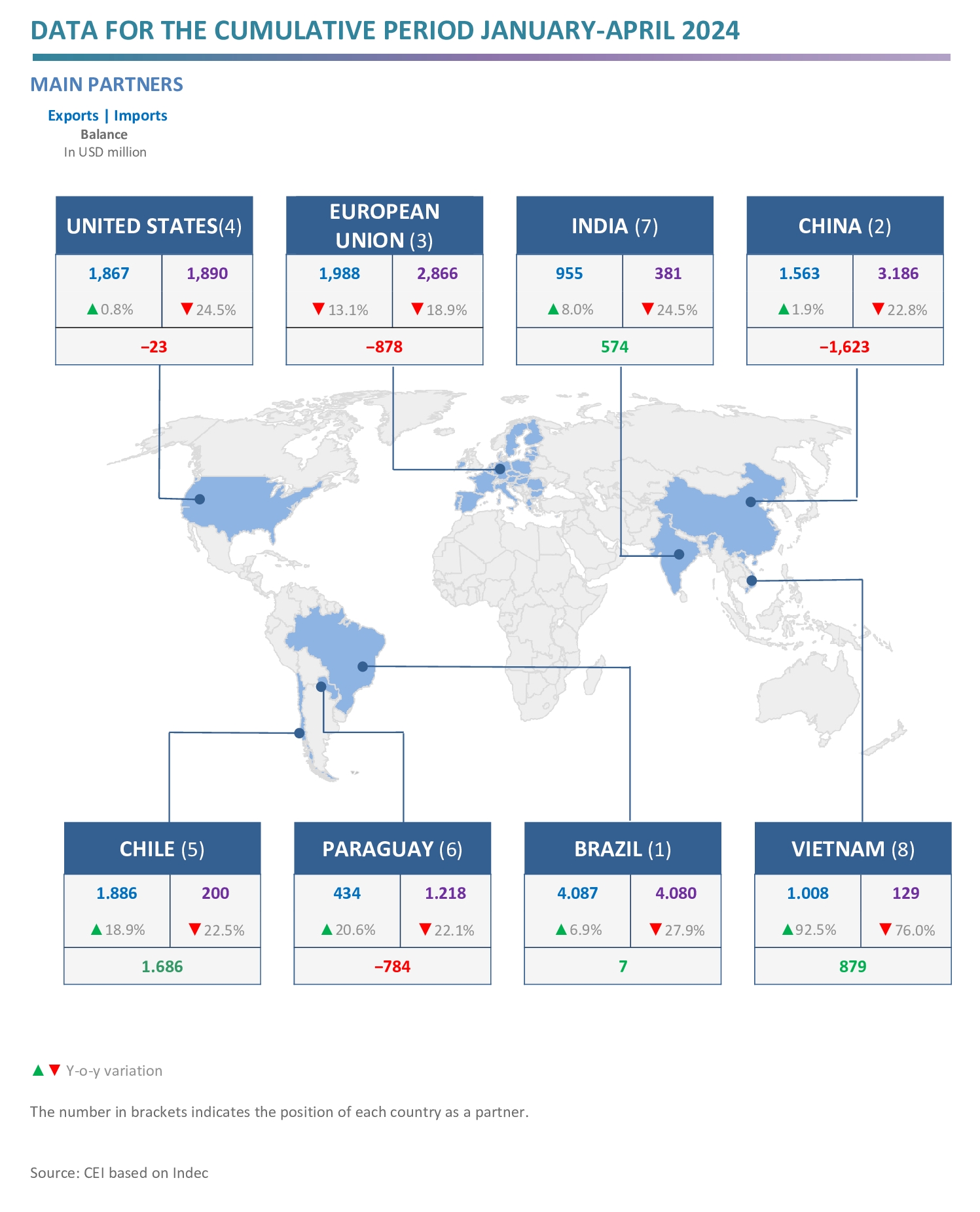 - The largest surpluses were obtained in trade with Chile (USD 1,686 million), Vietnam (USD 879 million), Peru (USD 815 million), India (USD 574 million), Indonesia (USD 525 million) and Saudi Arabia (USD 472 million); while the main deficits were registered with China (−USD 1,623 million), Paraguay (−USD 784 million) and Germany (−USD 597 million).