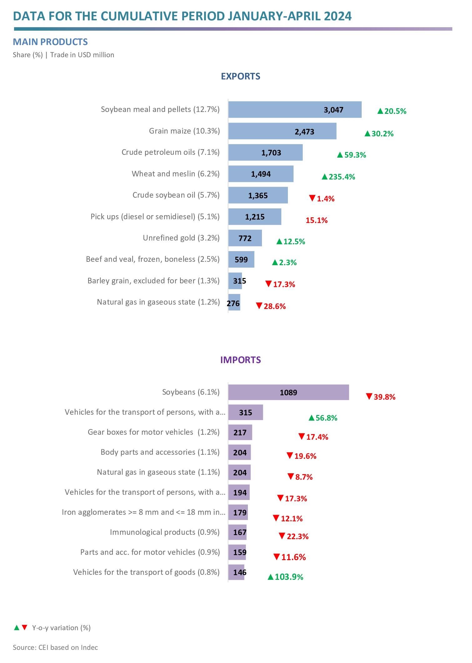 - Regarding imports, the most significant falls were observed in the purchases of gas oil (−USD 881 million), soybeans (−USD 720 million), and parts of telephones and devices for emission, transmission or reception (−USD 573 million); while imports of vehicles for the transport of persons with a cylinder capacity >1500 cm3 and <=3000 cm3 (USD 114 million), and urea (USD 79 million) grew.
