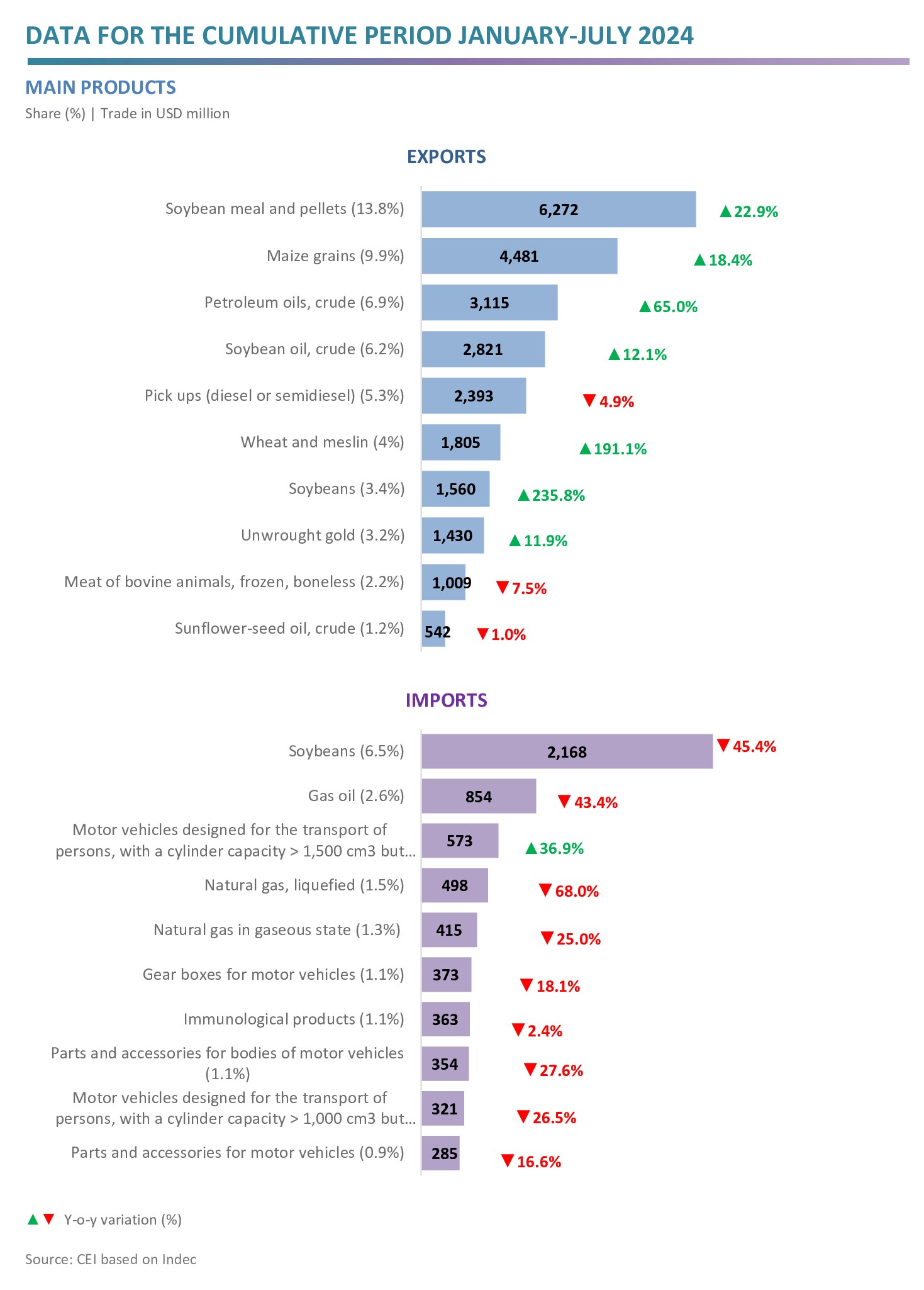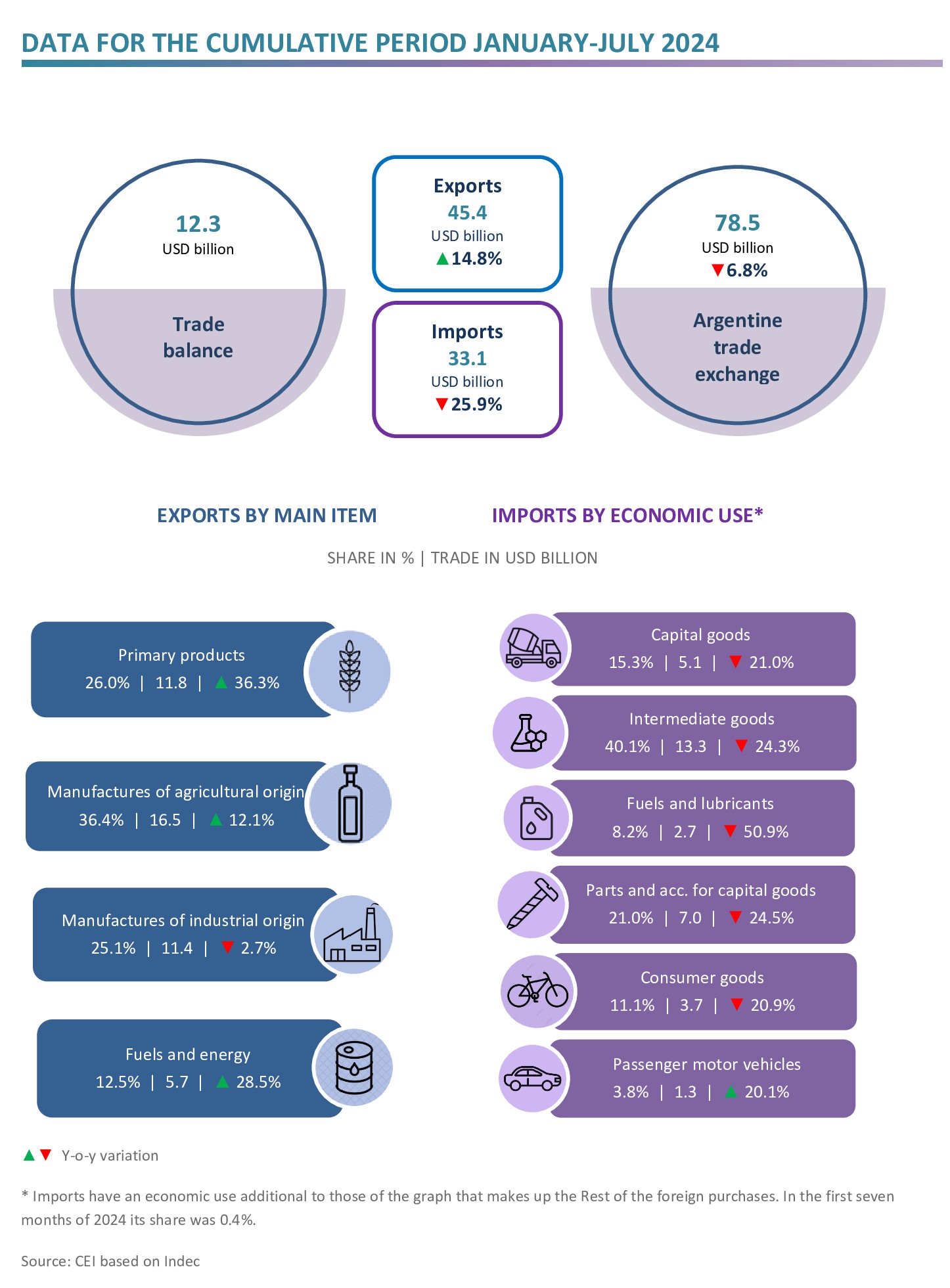 - As a consequence, the trade balance reached a USD 12.3 billion surplus, while in the first seven months of 2023, a USD 5.2 billion deficit had been recorded.