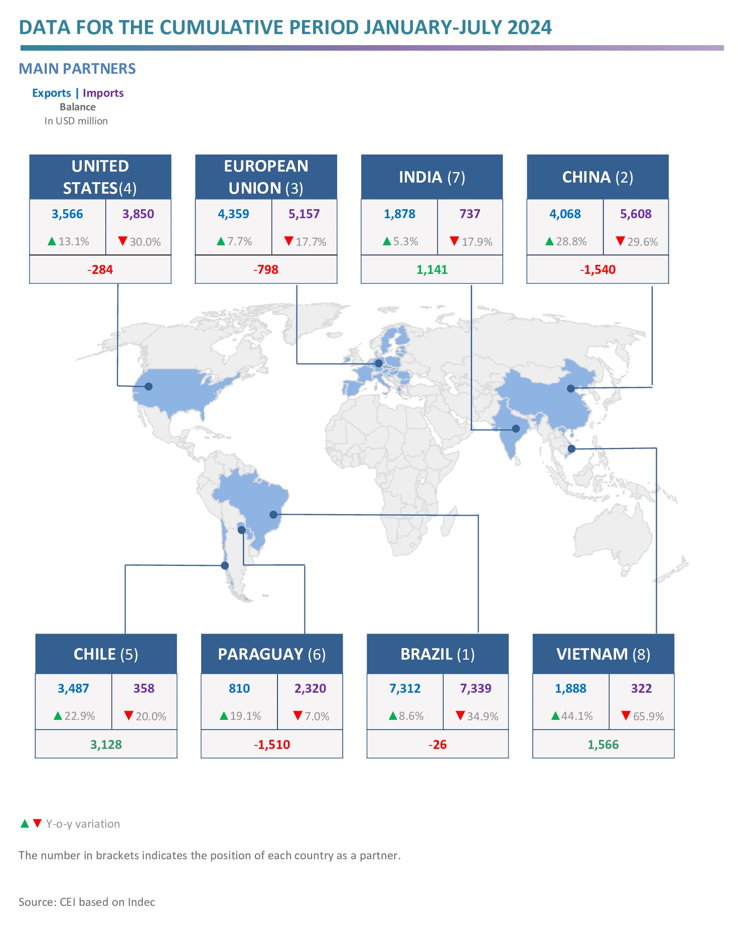 - The largest surpluses were obtained in trade with Chile (USD 3.1 billion), Vietnam (USD 1.6 billion), Peru (USD 1.3 billion), India (USD 1.1 billion) and Indonesia (USD 753 million); while the main deficits were recorded with China (‑USD 1.5 billion), Paraguay (‑USD 1.5 billion) and Germany (‑USD 1.0 billion).