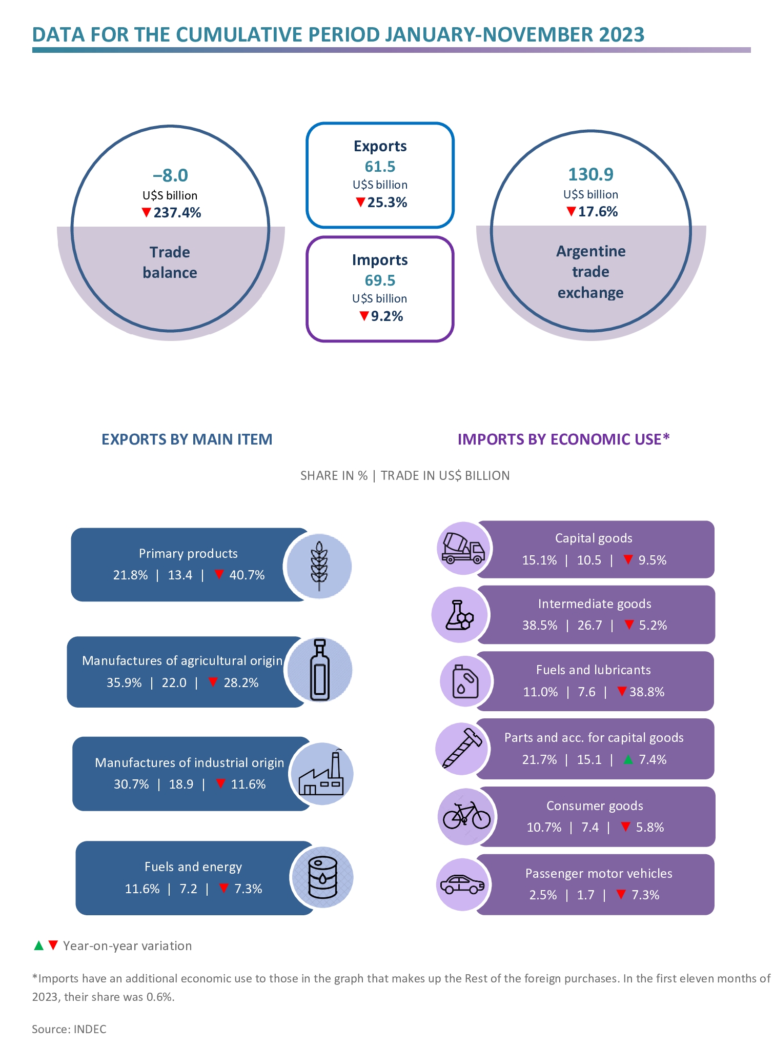- The trade balance recorded a deficit of US$ 8 billion, due to a greater contraction in exports than in imports. In the first eleven months of 2022 it had reached a US$ 5.8 billion surplus.