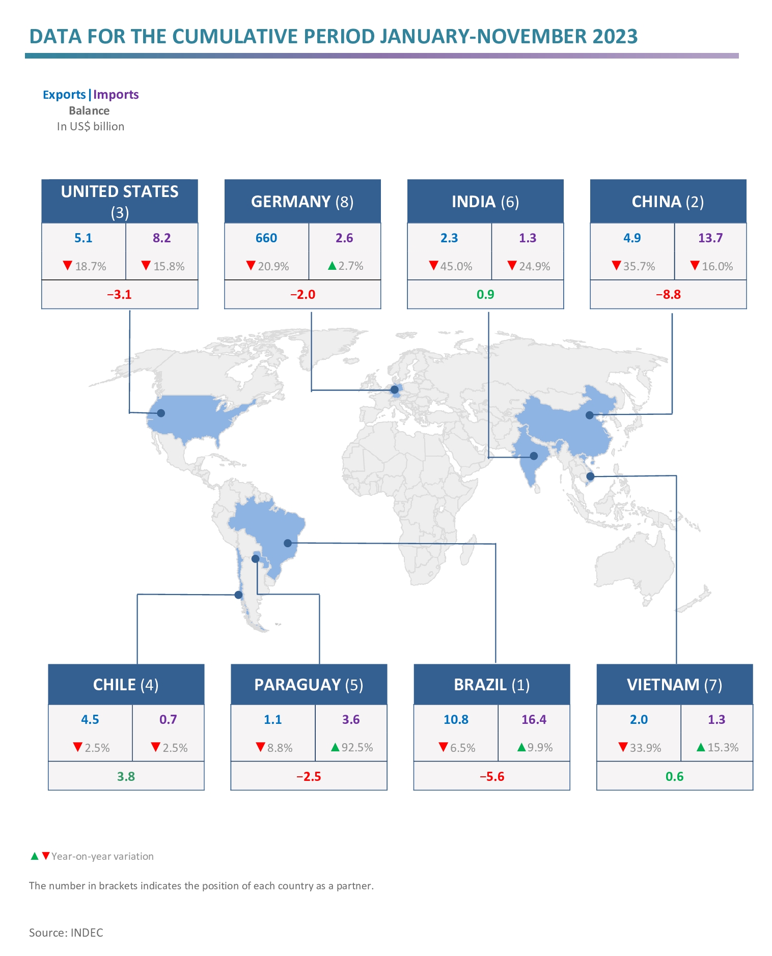 - The largest surpluses were obtained in trade with Chile (US$ 3.8 billion), Peru (US$ 2.1 billion), Uruguay (US$ 1.1 billion) and India (US$ 949 million); while the main deficits were recorded with China (−US$ 8.8 billion), Brazil (−US$ 5.6 billion), the United States (−US$ 3.2 billion), Paraguay (−US$ 2.5 billion), Germany (−US$ 2.0 billion) and Thailand (−US$ 1.4 billion).