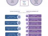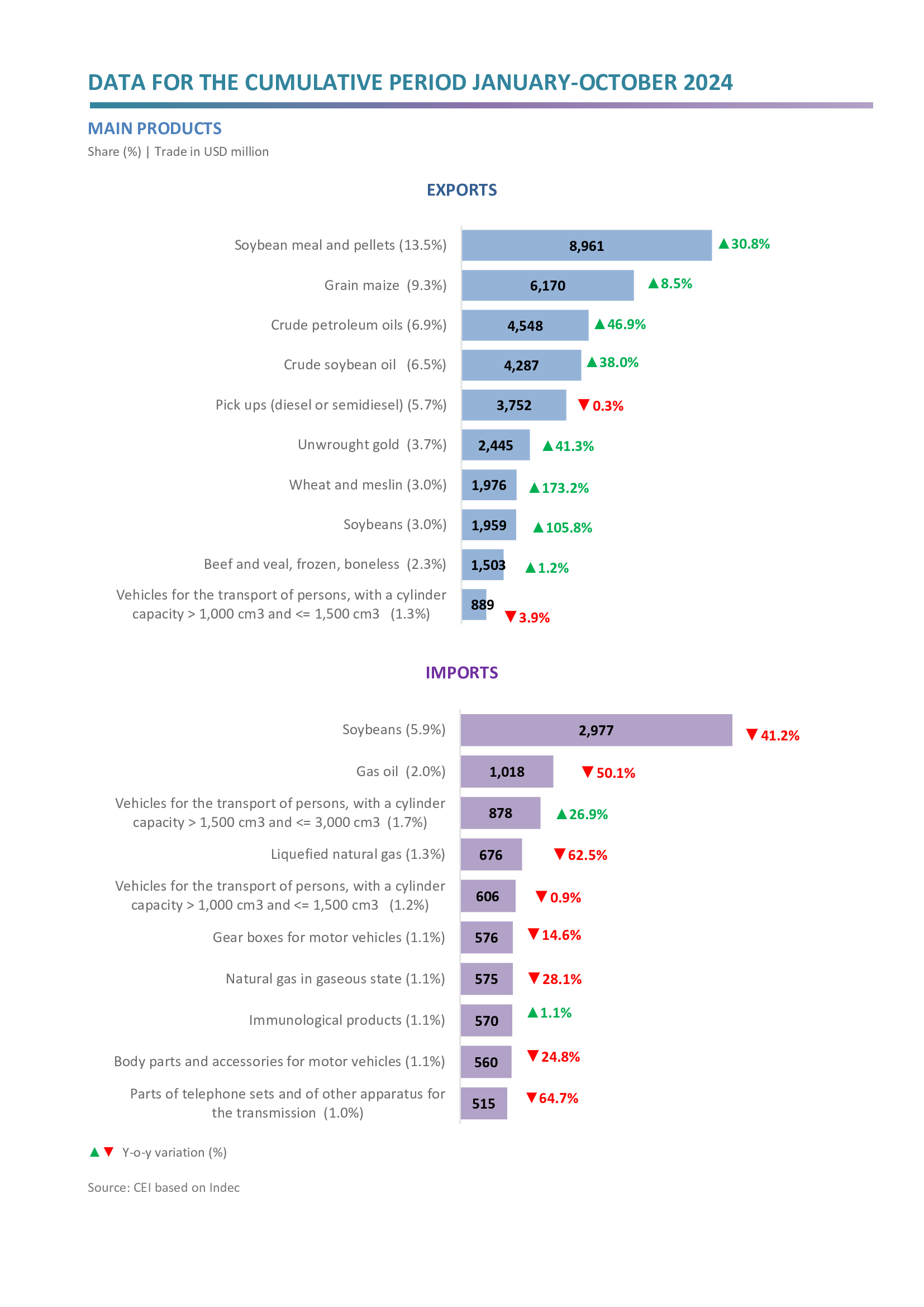 - In relation to imports, the most significant falls occurred in the purchases of soybeans (-US$ 2.1 billion), natural liquefied gas (-US$ 1.1 billion) and gas oil (-USD 1.0 billion), while imports of vehicles for the transport of persons (USD 502 million), and of goods (USD 184 million) grew.