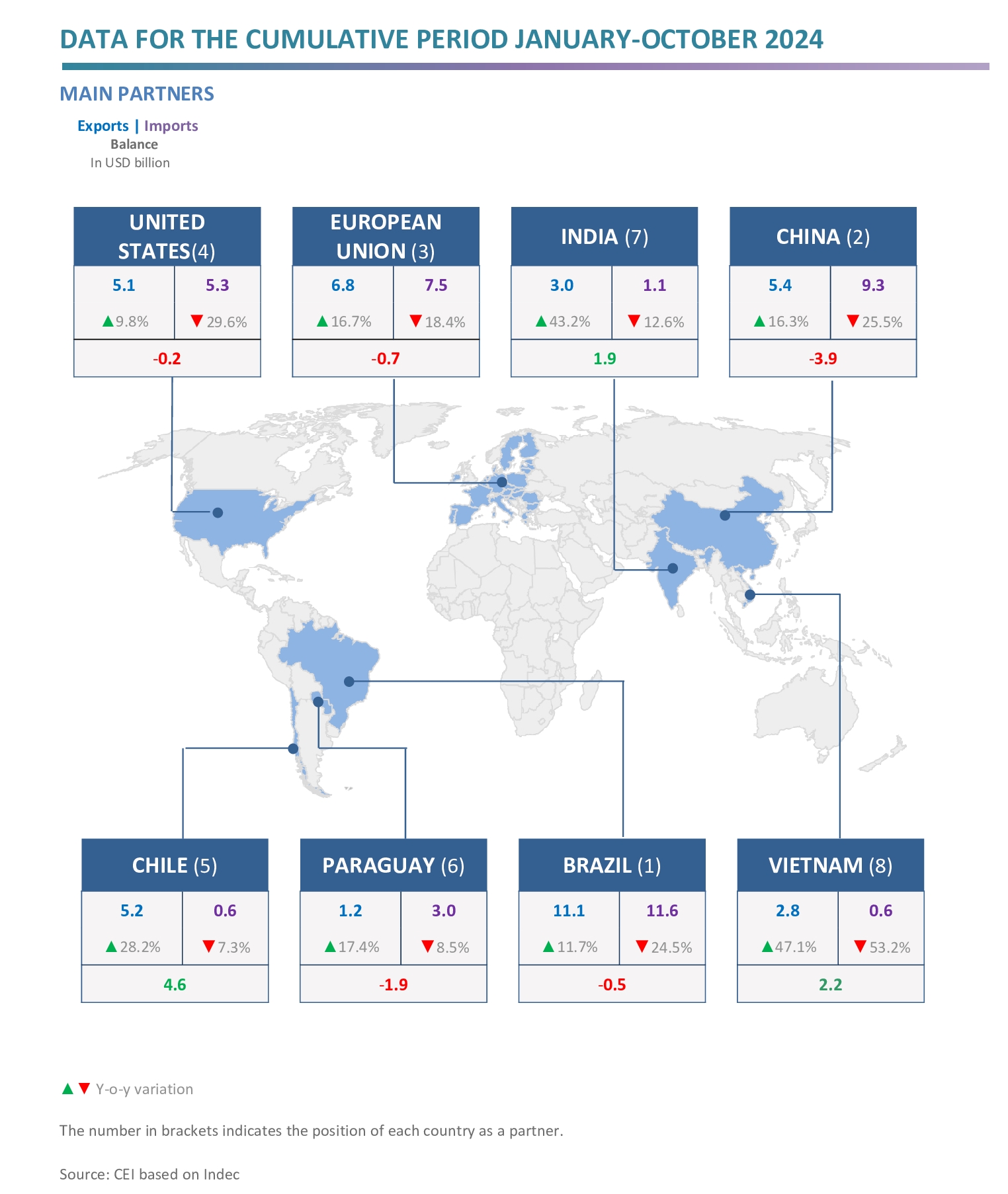 - The main export destinations were Brazil, with a 16.8% share, the EU, 10.3%, China, 8.1% and Chile, 7.9%. In turn, the most prominent sources of imports were: Brazil, 23.1% of total imports, China, 18.5%, the EU, 14.9%, and the United States, 10.6%.