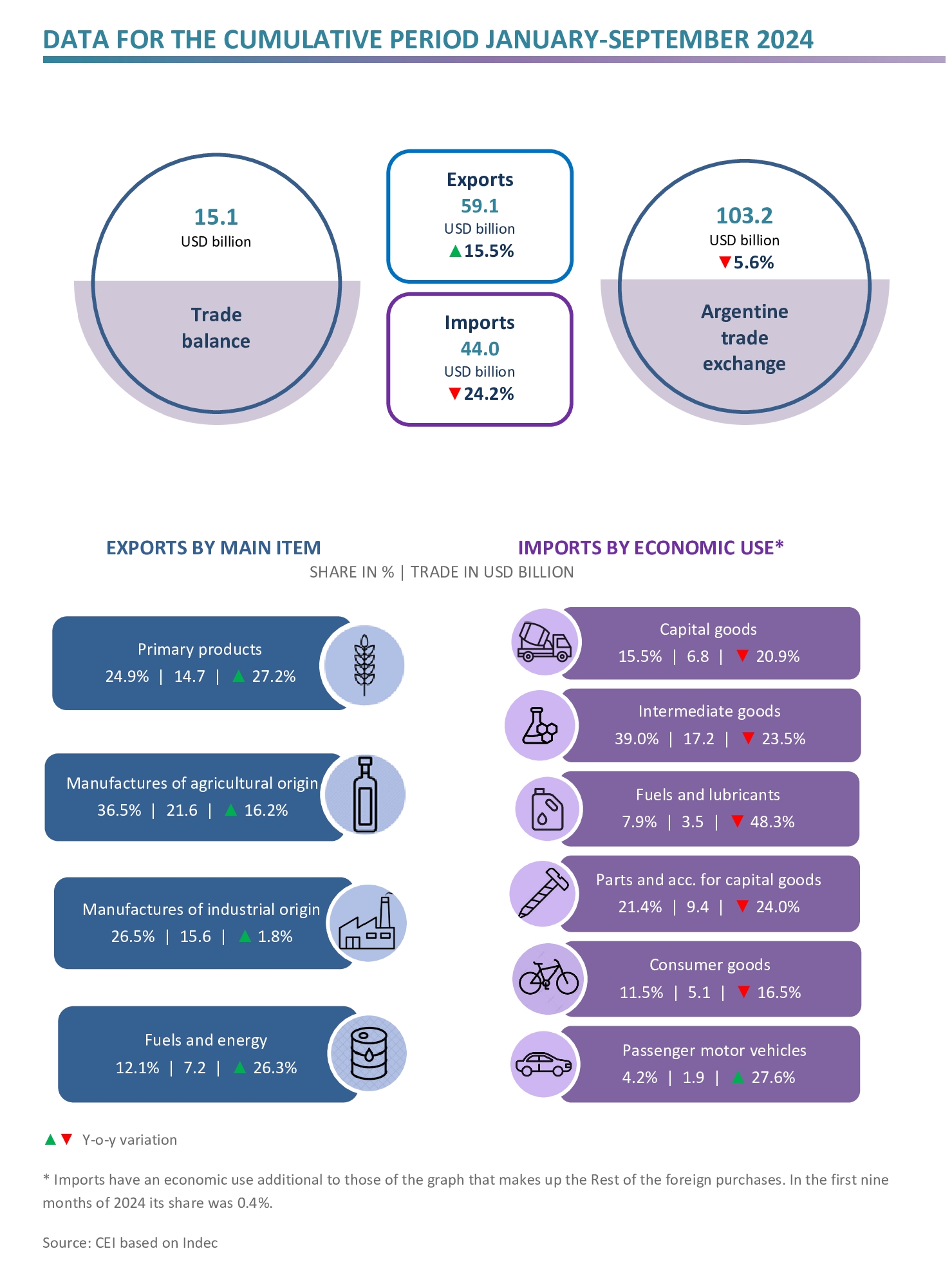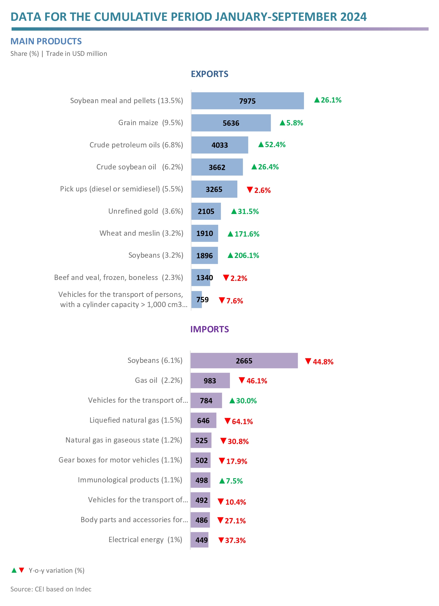 - Regarding imports, the most significant falls occurred in the purchases of soybeans (-USD 2.2 billion), liquefied natural gas (-USD 1.2 billion) and parts of telephones and devices for broadcasting, transmitting or receiving (-USD 936 million); while imports of vehicles for the transport of persons (USD 393 million), and of goods (USD 109 million) grew.