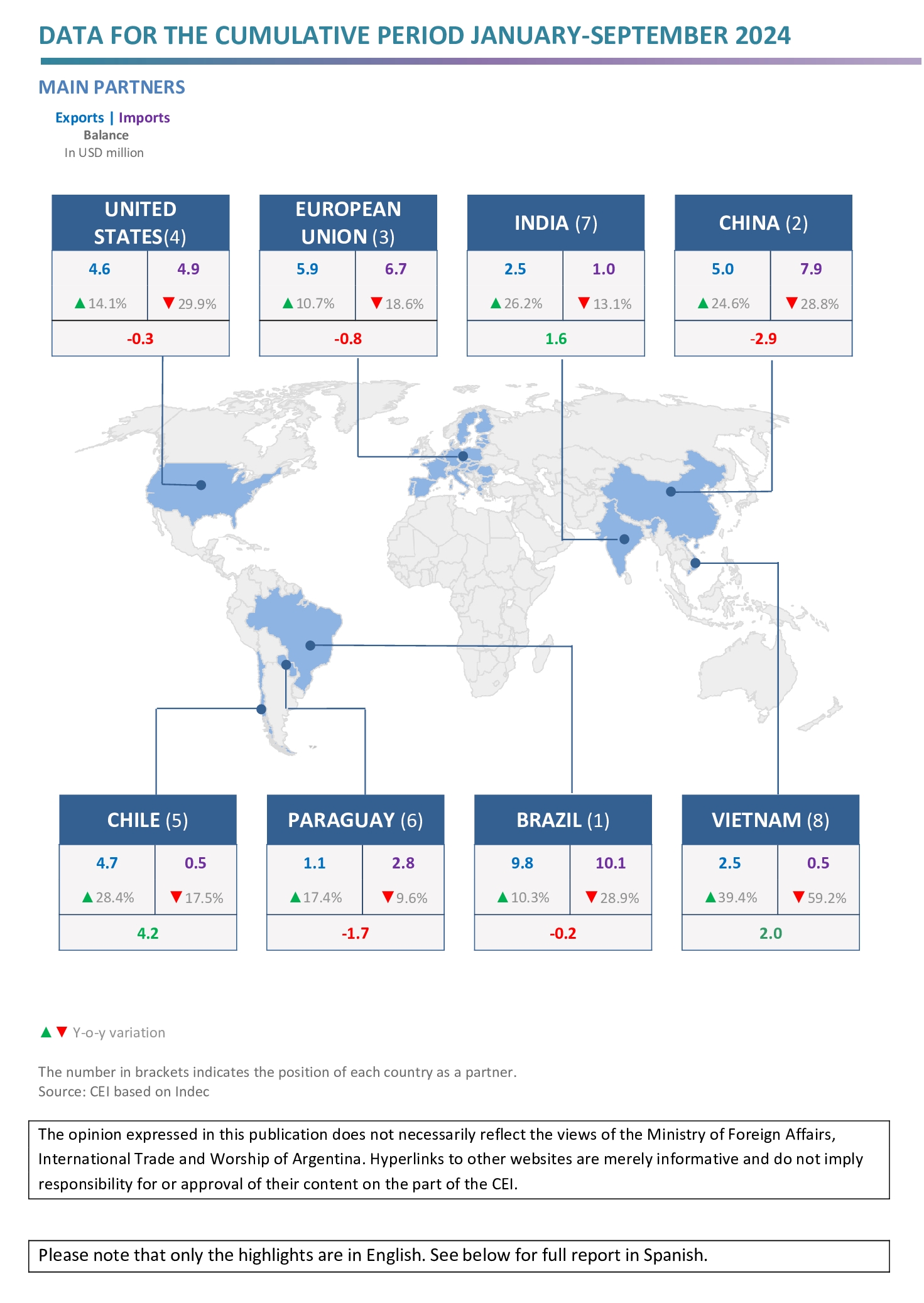 - The largest surpluses were obtained in trade with Chile (USD 4.2 billion), Vietnam (USD 2.0 billion), Peru (USD 1.7 billion), India (USD 1.6 billion), and Saudi Arabia (USD 1.0 billion); while the main deficits were registered with China (-USD 2.9 billion), Paraguay (-USD 1.7 billion) and Germany (-USD 1.4 billion).