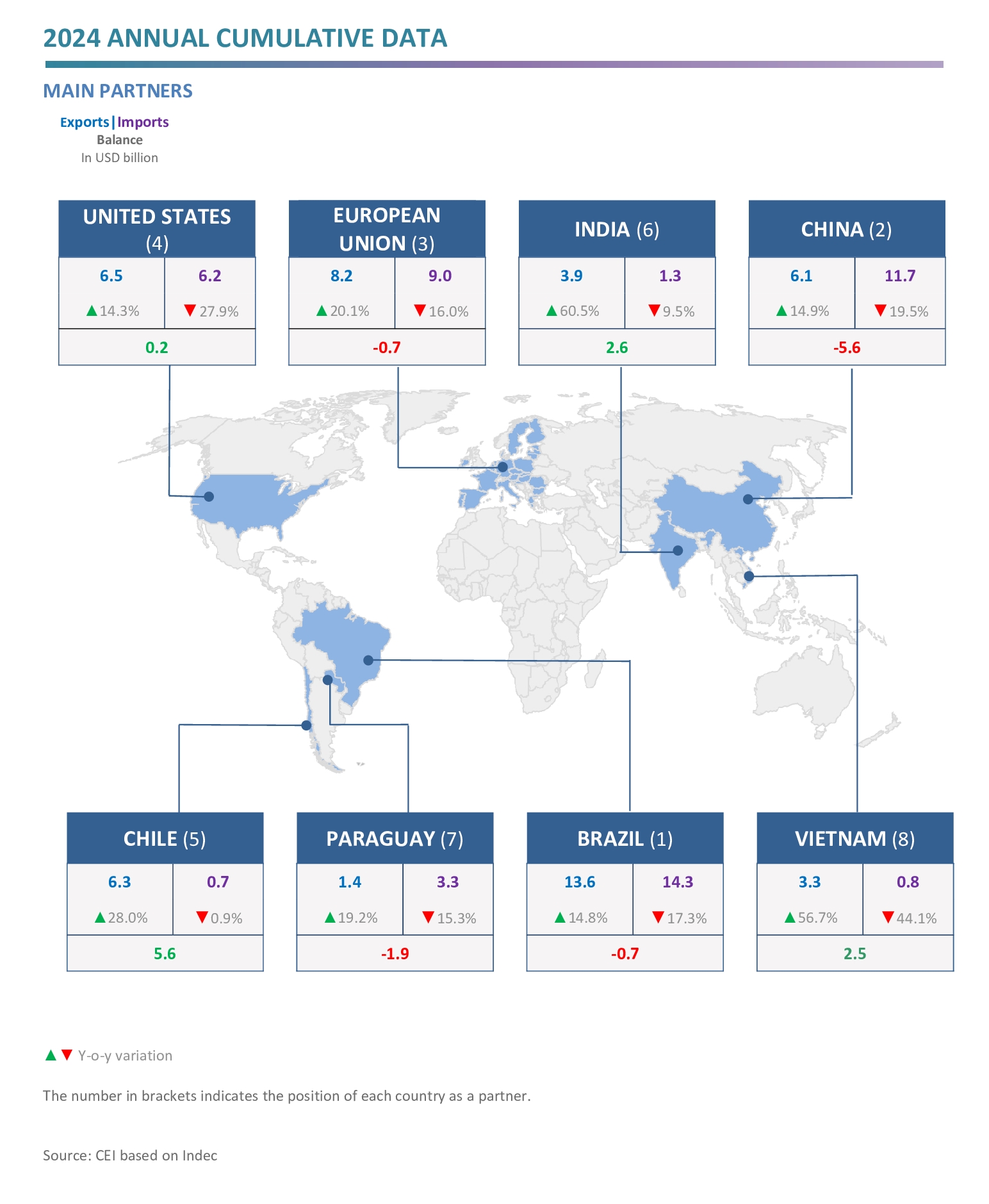- The largest surpluses were obtained in trade with Chile (USD 5.6 billion), India (USD 2.6 billion), Vietnam (USD 2.5 billion), Peru (USD 2.2 billion) and Saudi Arabia (USD 1.4 billion); while the main deficits were recorded with China (-USD 5.6 billion), Paraguay (-USD 1.9 billion) and Germany (-USD 1.8 billion).