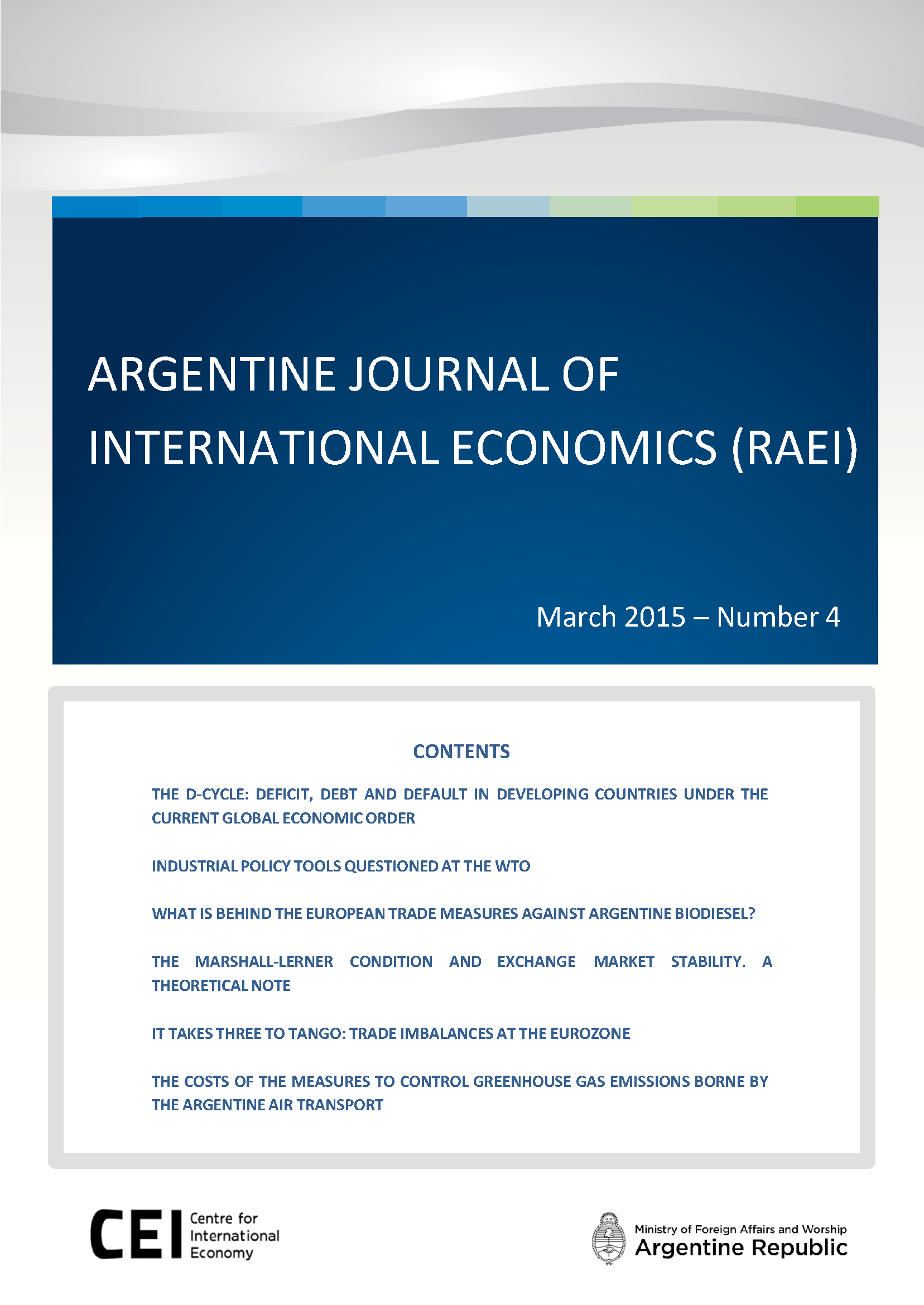 This is the fourth edition of the Argentine Journal of International Economics (RAEI) by CEI, which mainly focuses on topics related to international trade and trade negotiations.