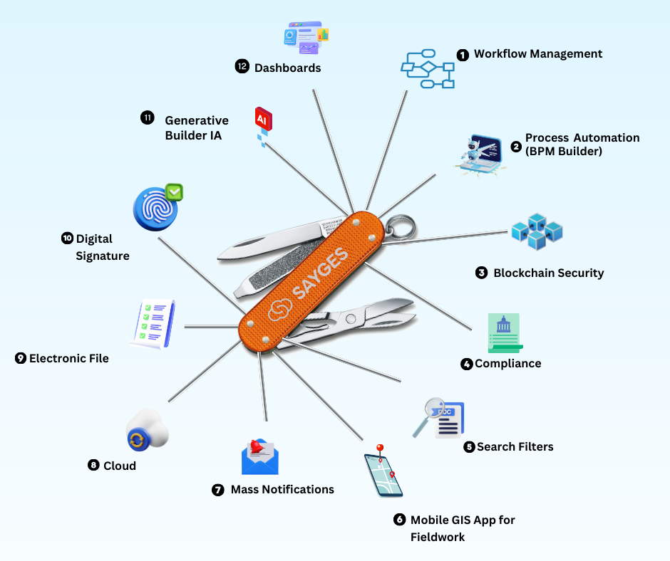 Sayges Cloud is a comprehensive digital platform designed to modernize institutions. It offers document management, process automation, digital signature, customer service, and 24/7 online procedures. With artificial intelligence, blockchain, and scalable architecture, it enables greater efficiency, security, and transparency across organizations.