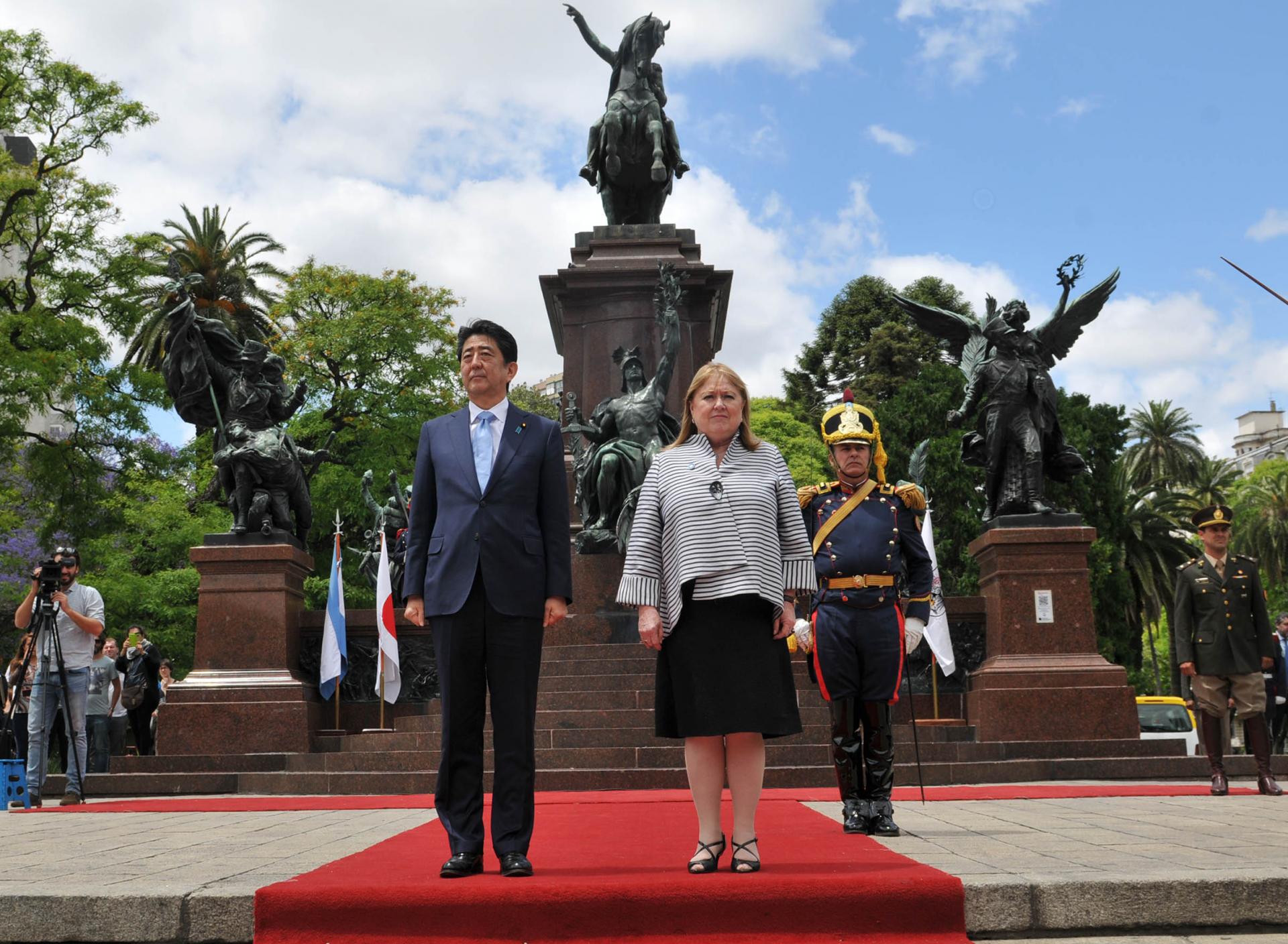 Luego de este encuentro, el Primer Ministro japonés, Shinzo Abe, fue recibido por la canciller Susana Malcorra para realizar la tradicional ofrenda floral al Libertador en la plaza San Martín.