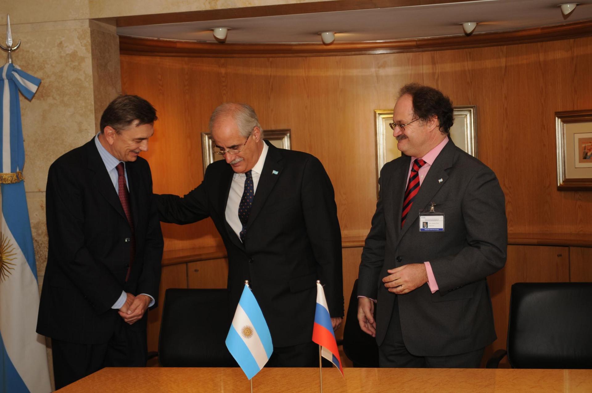 Buenos Aires, Marzo 11 de 2009 El Canciller Jorge Taiana, el embajador de Rusia Yuri Korchagin y el embajador argentino en Rusia, Leopoldo Bravo, durante la firma del convenio bilateral sobre supresión de visado para ciudadanos de ambos países. foto Rober