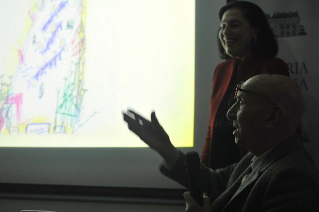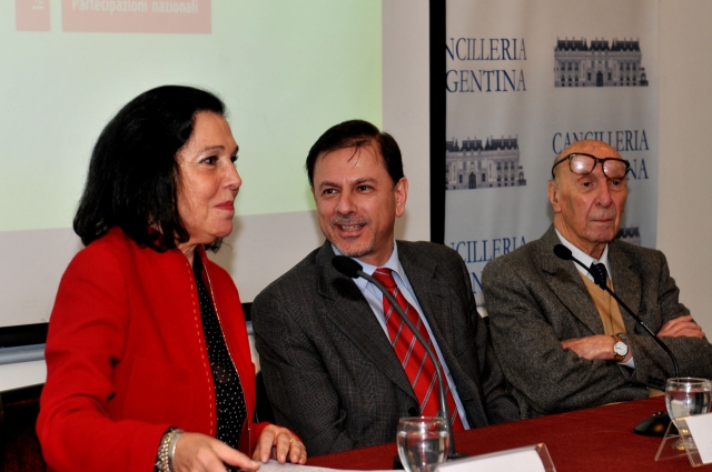 El Vicecanciller argentino, Eduardo Zuaín junto al arquitecto, artista plástico y curador de la presentación argentina, Clorindo Testa, y la Embajadora Magdalena Faillace, Directora de Asuntos Culturales de la Cancillería.