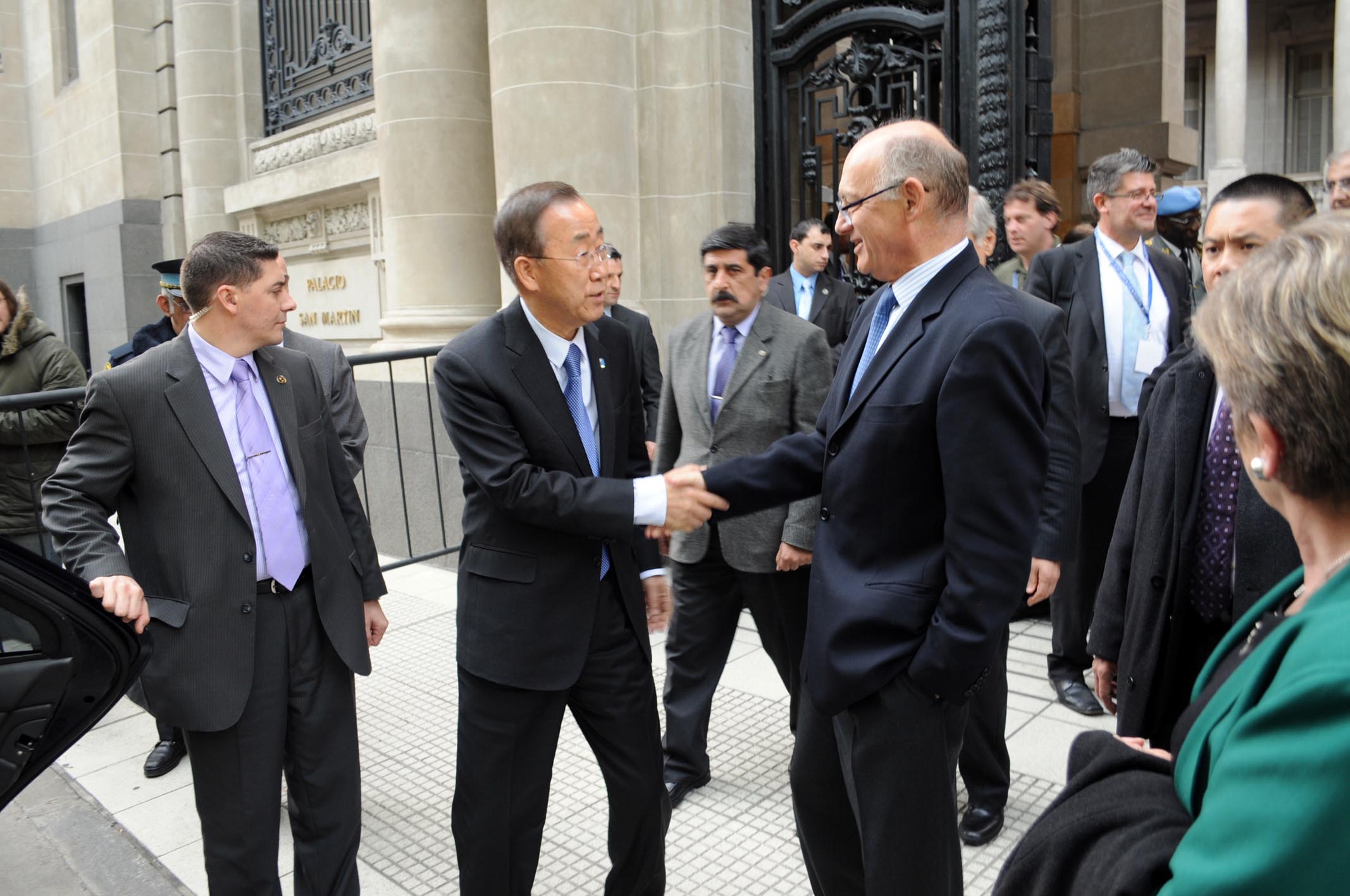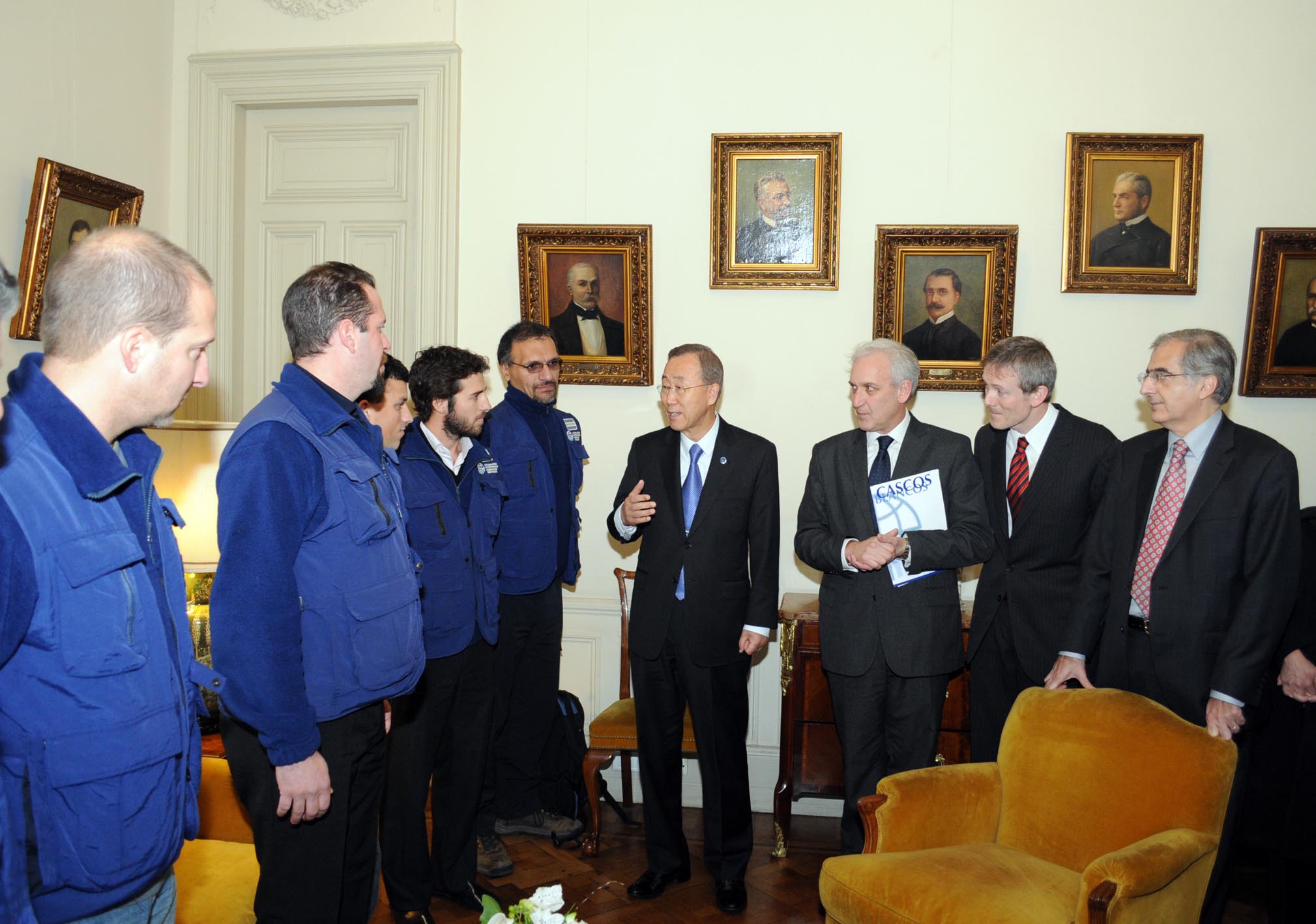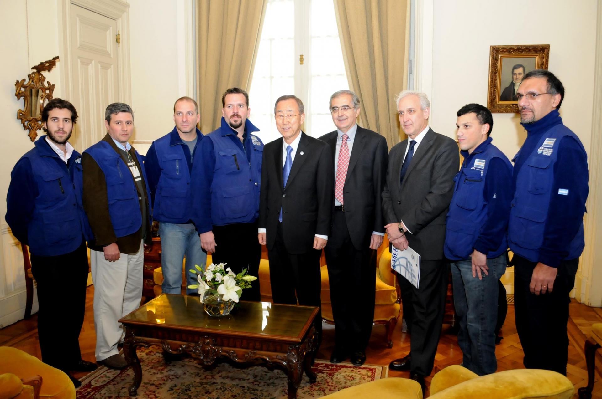 Luego del almuerzo de honor que le ofreciera el Canciller Héctor Timerman, el Secretario General de Naciones Unidas, Ban Ki-moon, saludó hoy en el Palacio San Martín a los voluntarios argentinos de Cascos Blancos que, en el marco de la misión de ACNUR (ON