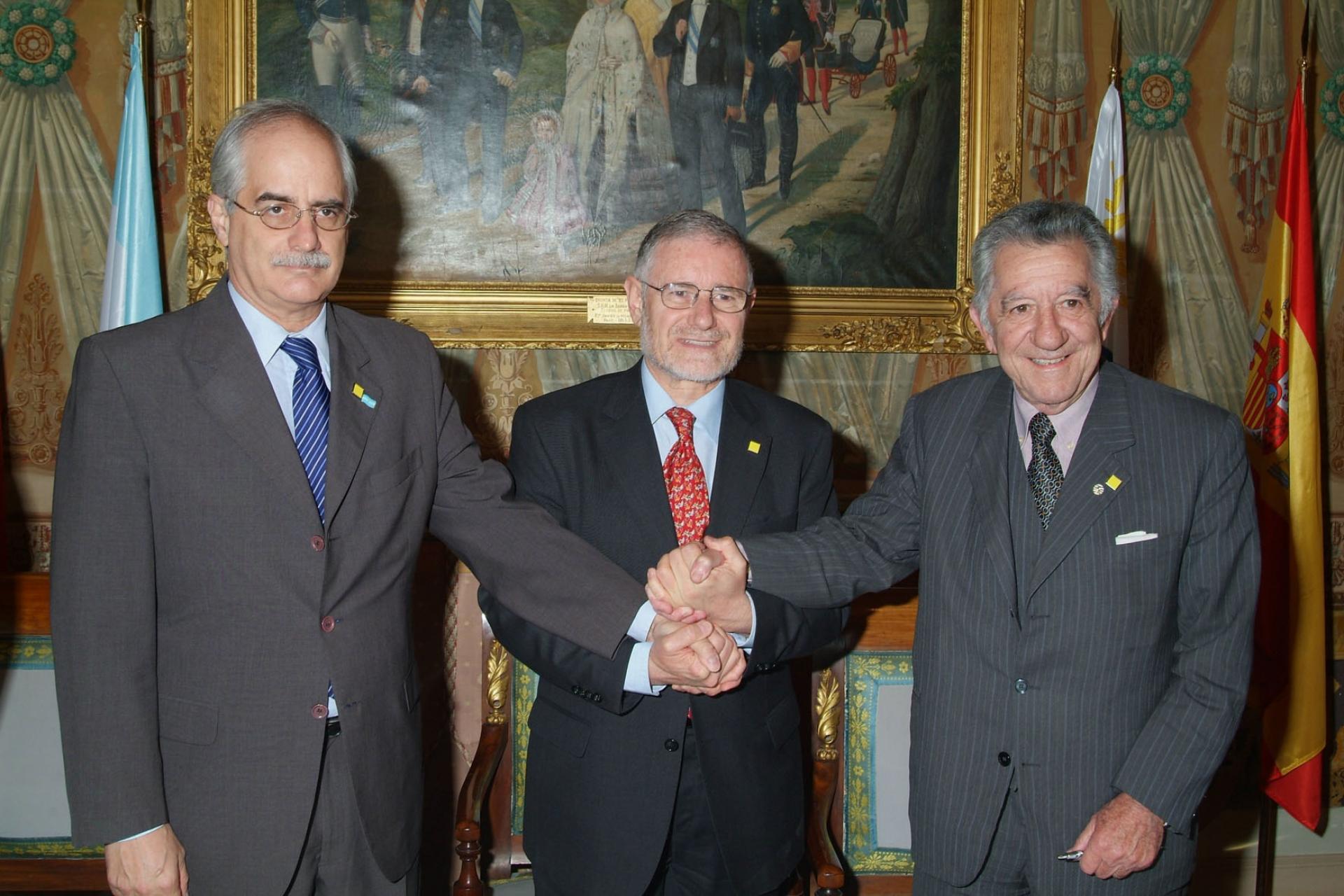 Madrid, Abril 20 de 2007Los cancilleres Jorge Taiana (Argentina) y Reynaldo Gargano (Uruguay) junto al facilitador real Embajador Jose Antonio Yañez Barnuevo, al firmar la "Declaración de Madrid"