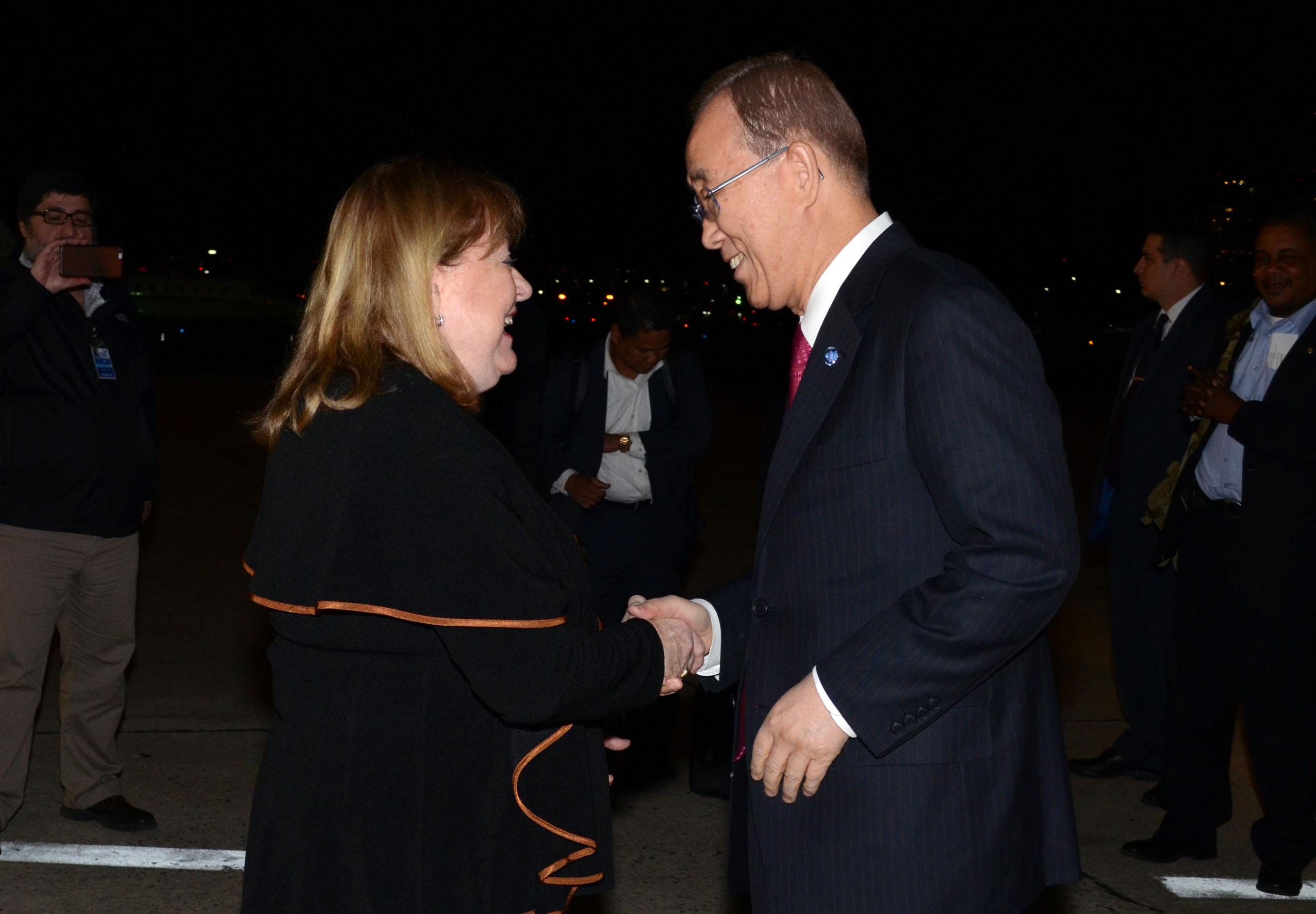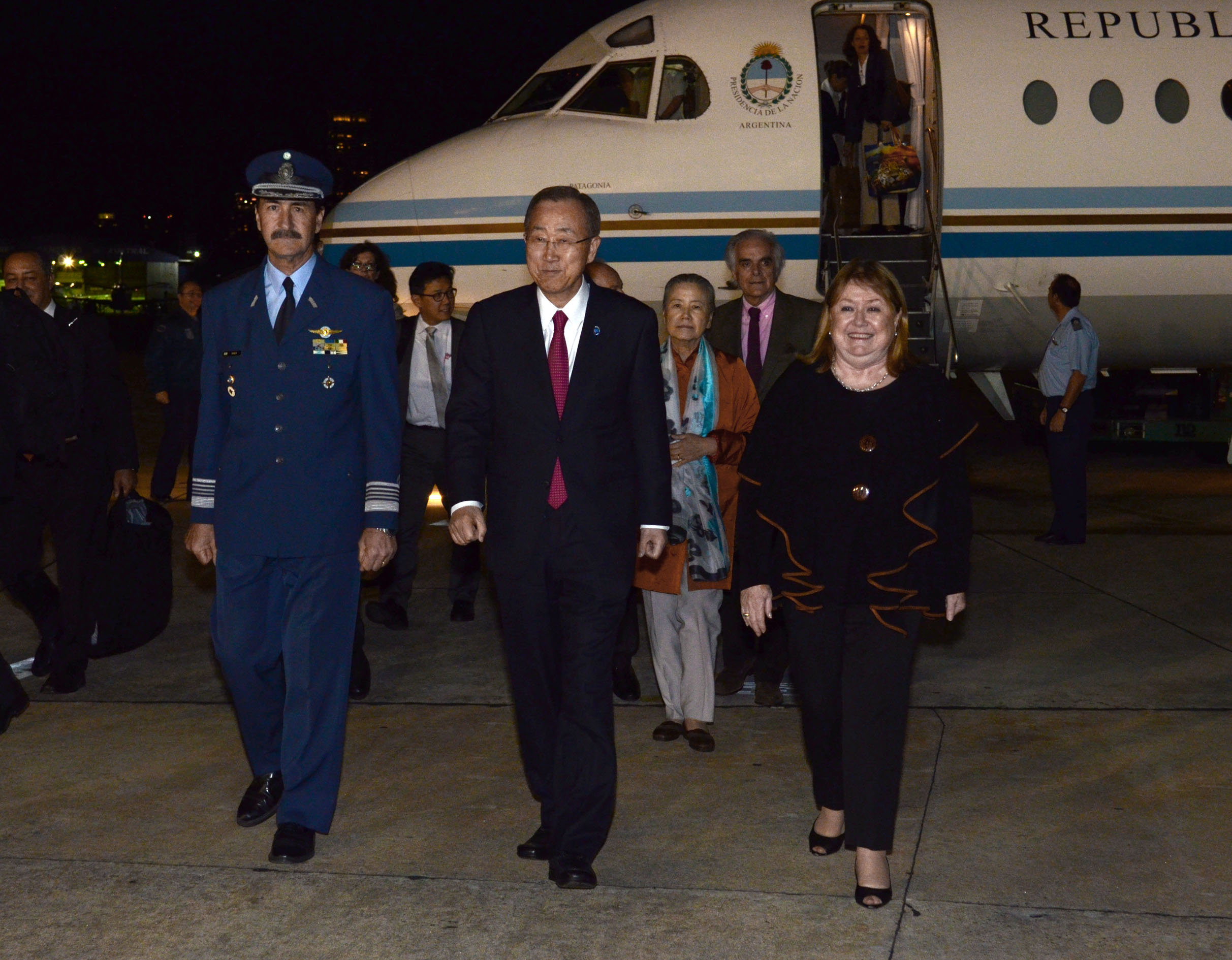 La Canciller Susana Malcorra recibió anoche en la Aeroestación Militar Aeroparque al Secretario General de Naciones Unidas, Ban Ki-moon. Foto: Roberto Daniel Garagiola