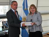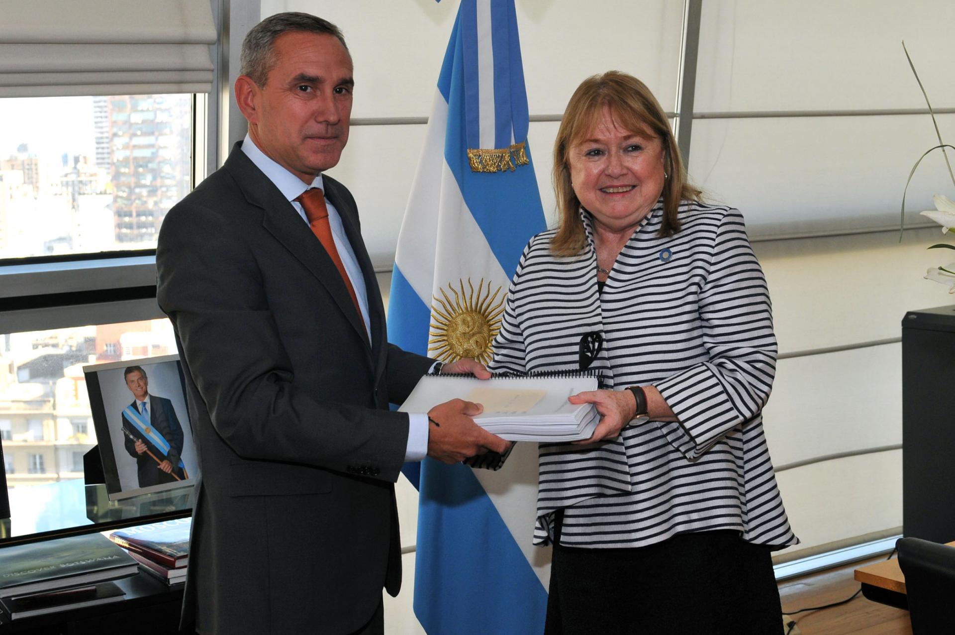 La Canciller Susana Malcorra recibió hoy de manos del Presidente de la Delegación Argentina de la Comision Administradora del Rio Uruguay (CARU), Héctor Vazón, los informes con los resultados correspondientes a las actividades de monitoreo del Comité Científico en la planta Orión (ex Botnia) y en los ríos Gualeguaychú y Uruguay. Foto: Roberto Daniel Garagiola