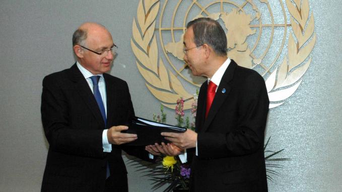 ONU, Febrero10 de 2012. El Canciller Héctor Timerman entrega la presentación argentina acerca de la militarización del Atlántico Sur por parte de Gran Bretania a Ban Ki-moon.