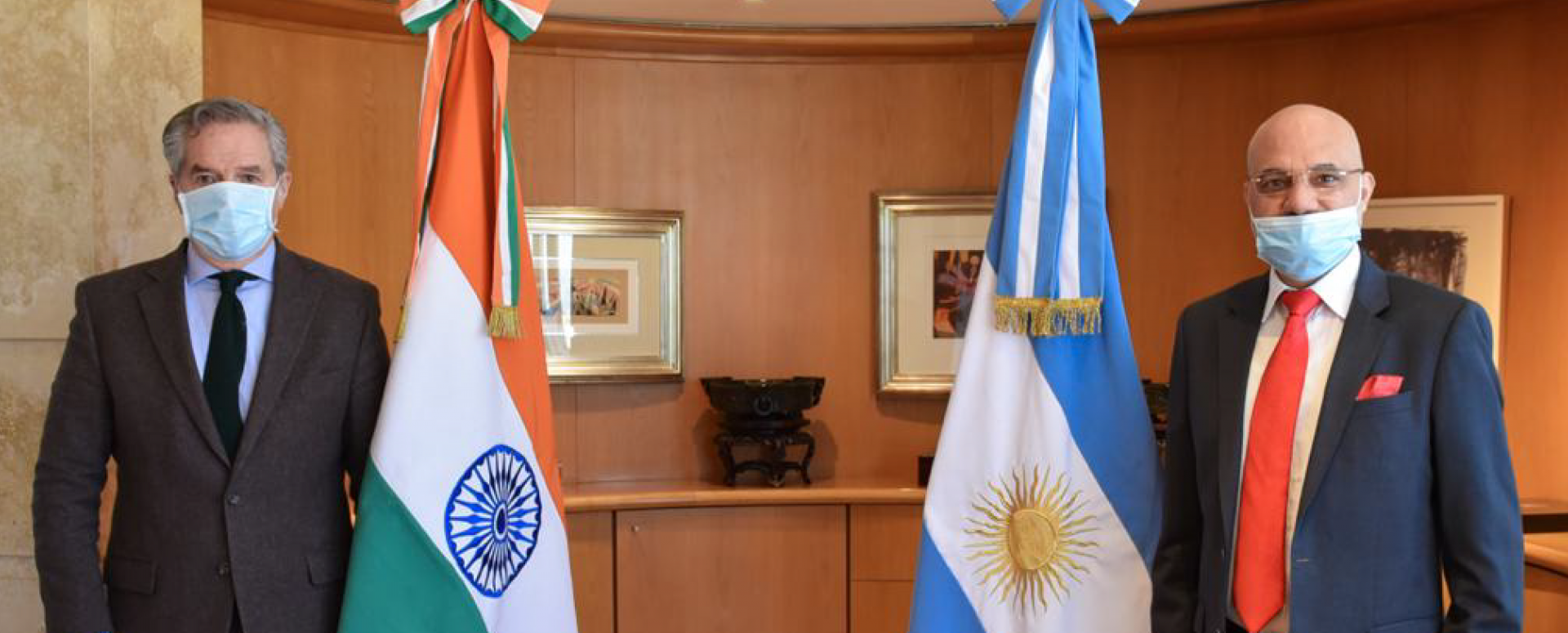 El Canciller Felipe Solá mantuvo hoy una reunión de trabajo con el embajador de la India en nuestro país, Dinesh Bhatia, con quien repasó la agenda bilateral con el objetivo de afianzar la cooperación en altas tecnologías, como asuntos espaciales, tecnologías de la información y las comunicaciones, además de temas vinculados a la minería, energía, agroindustria, comercio e inversiones. También dialogaron sobre los principales puntos en común frente a los desafíos que presenta la emergencia mundial del COVID-19.