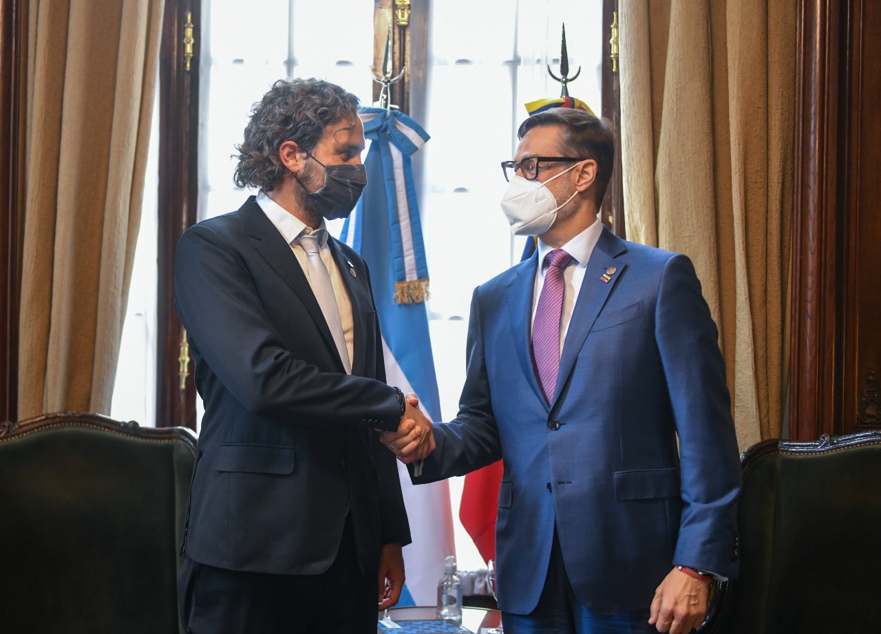 El canciller Santiago Cafiero mantuvo hoy una reunión bilateral con el secretario de Relaciones Exteriores de México, Marcelo Ebrard Casaubon, donde le agradeció especialmente su participación en la XXII Reunión de Cancilleres de la Comunidad de Estados Latinoamericanos y Caribeños (CELAC), en calidad de Presidencia saliente. Del encuentro formaron parte también la ministra de Salud, Carla Vizzotti; de Ciencia, Tecnología e Innovación, Daniel Filmus, y el embajador argentino en México, Carlos Tomada.