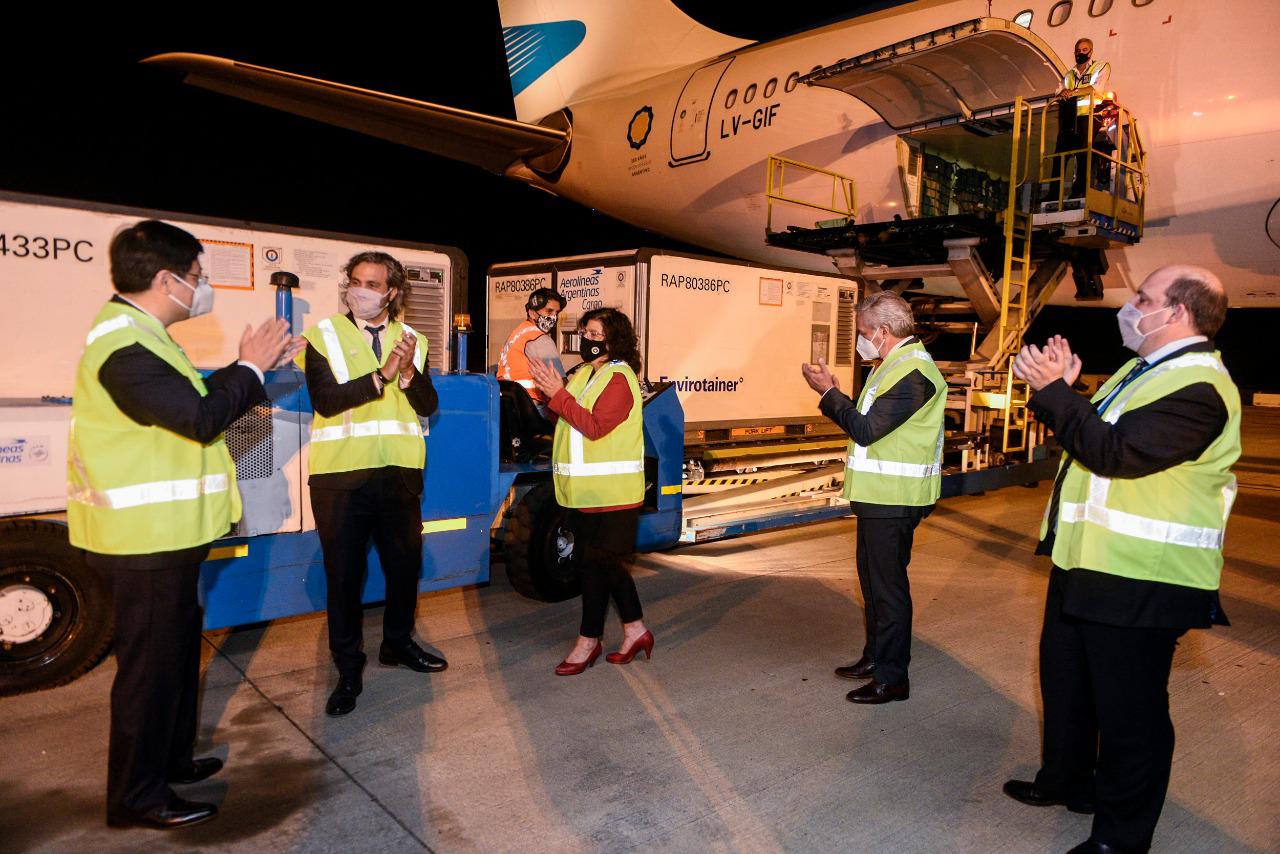 Un vuelo de Aerolíneas Argentinas que transportaba una partida de 904 mil vacunas Sinopharm contra el coronavirus arribó el 25 de febrero al Aeropuerto Internacional de Ezeiza proveniente de la República Popular China.