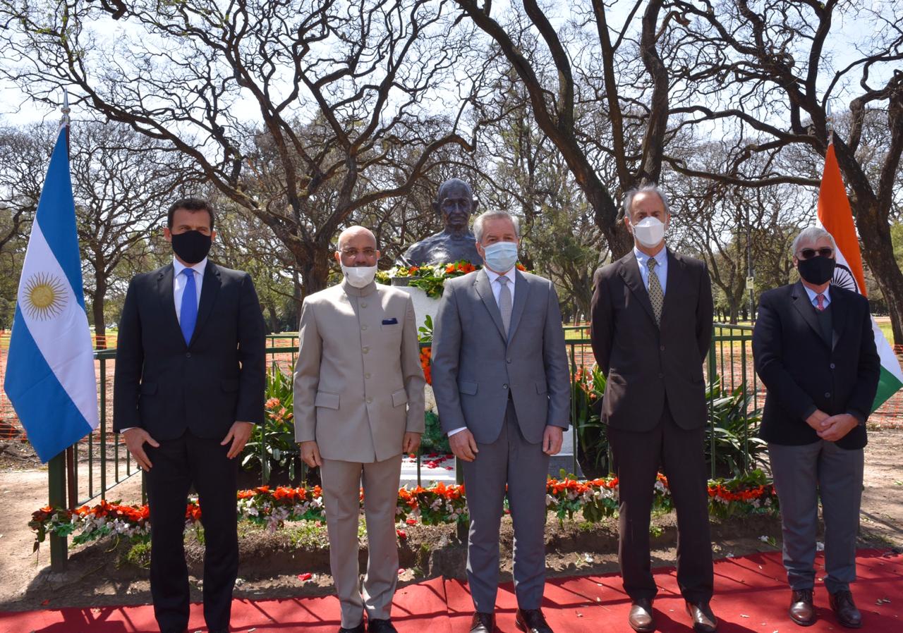 El canciller Felipe Solá participó hoy del cierre de la celebración del 150° Aniversario del Natalicio de Mahatma Gandhi -que duraron dos años- organizada por la Embajada de la India en la Argentina. Durante la ceremonia el ministro y el embajador Dinesh Bhatia realizaron una ofrenda floral ante el busto de Mahatma Gandhi en la Plaza Sicilia de la ciudad de Buenos Aires.